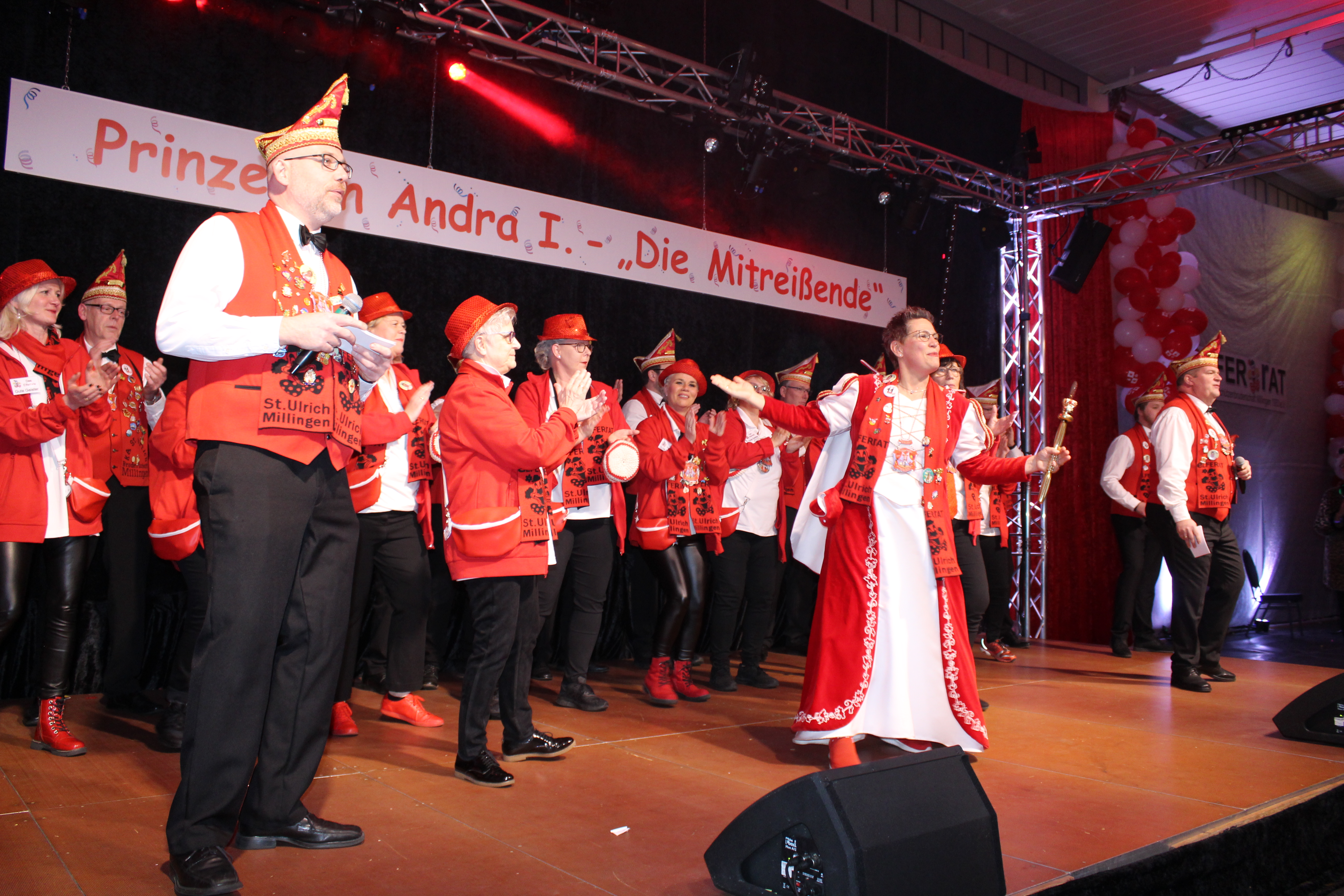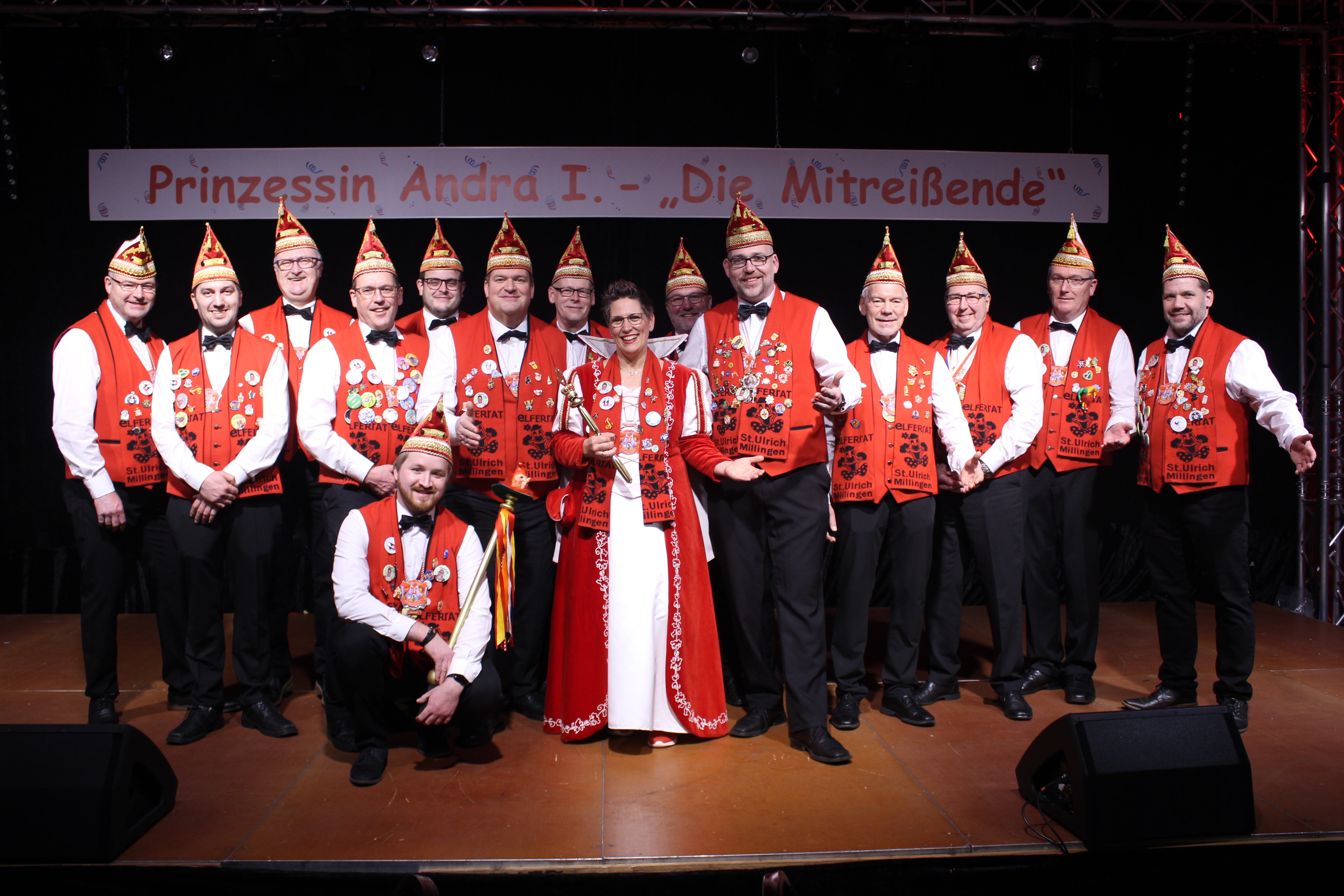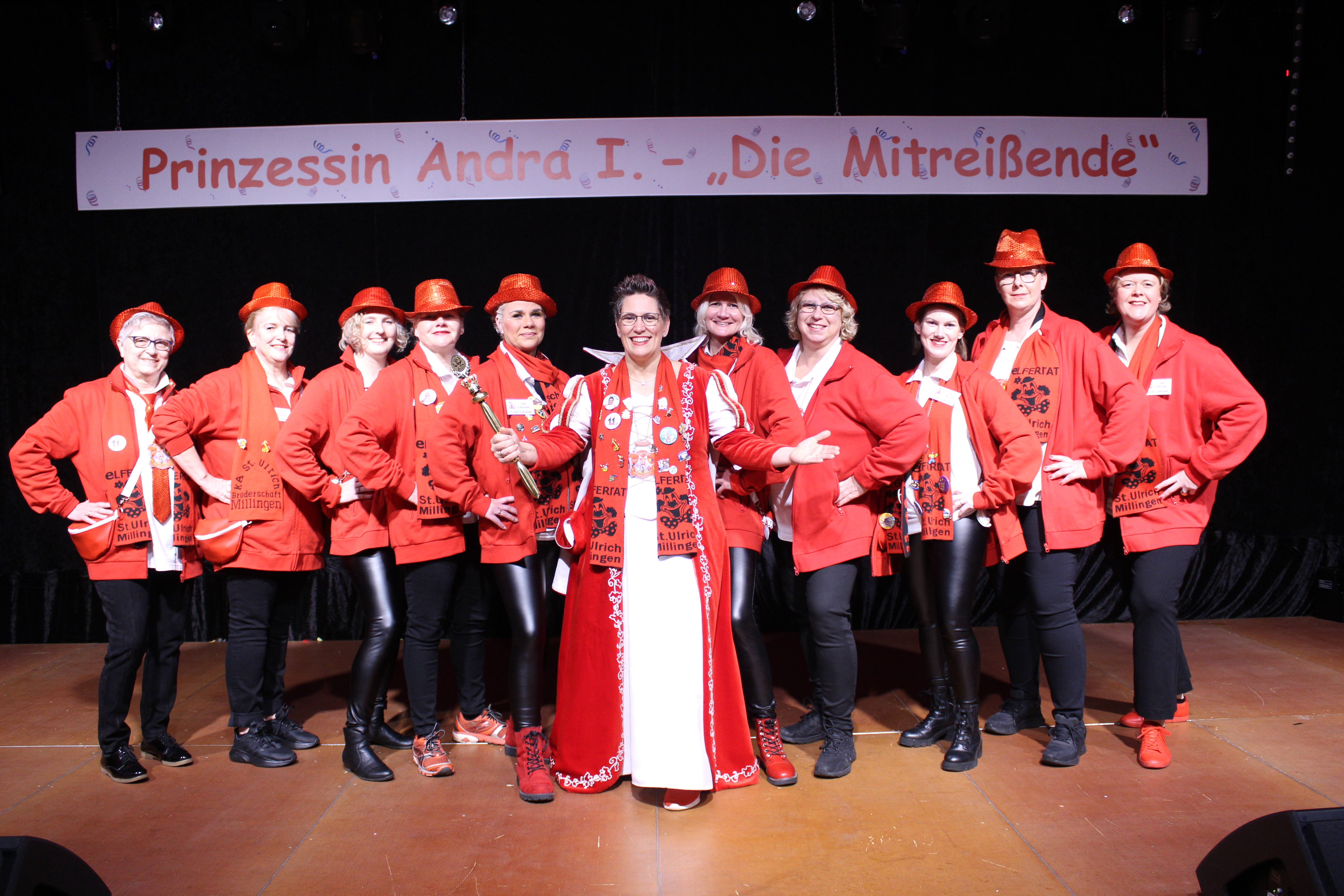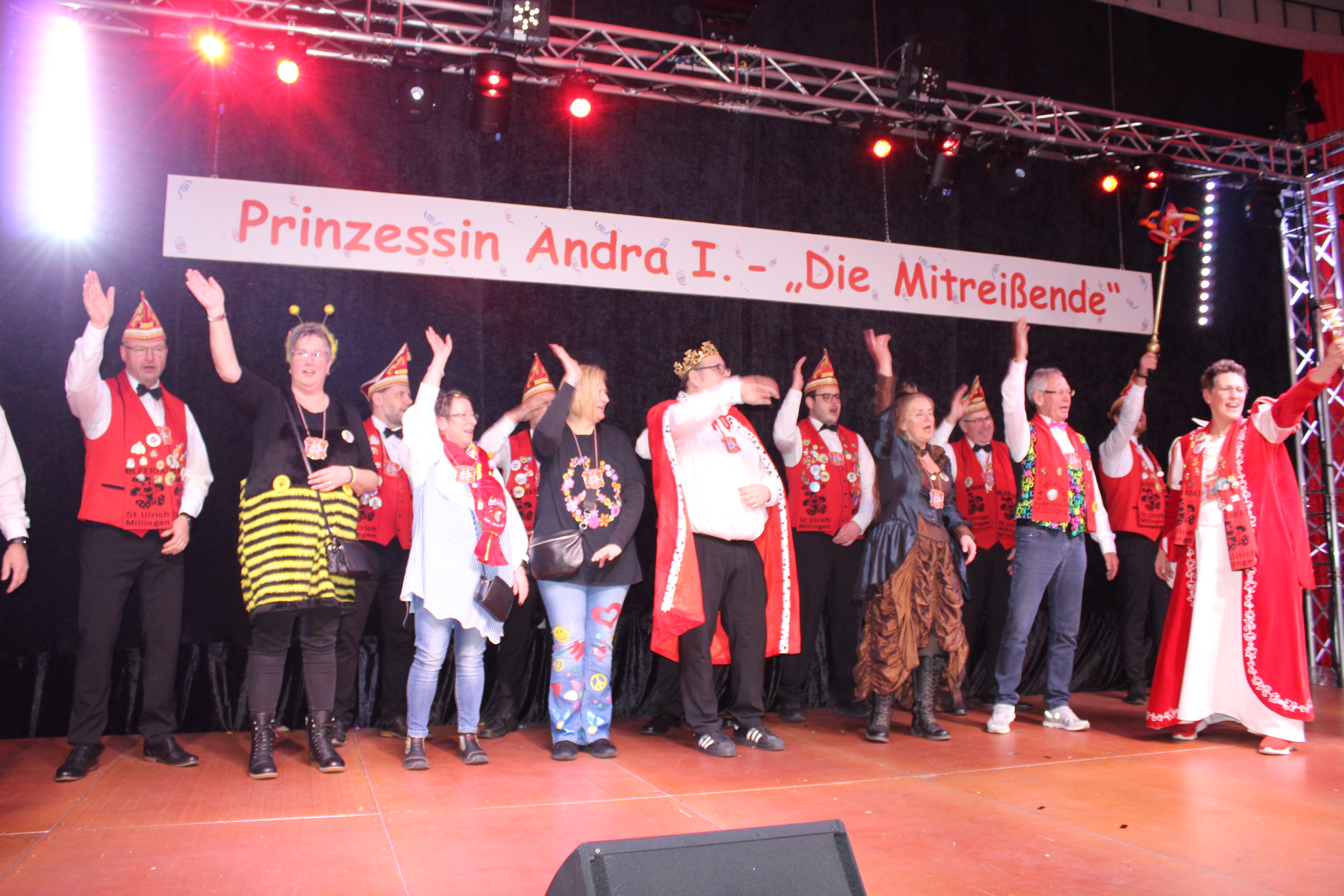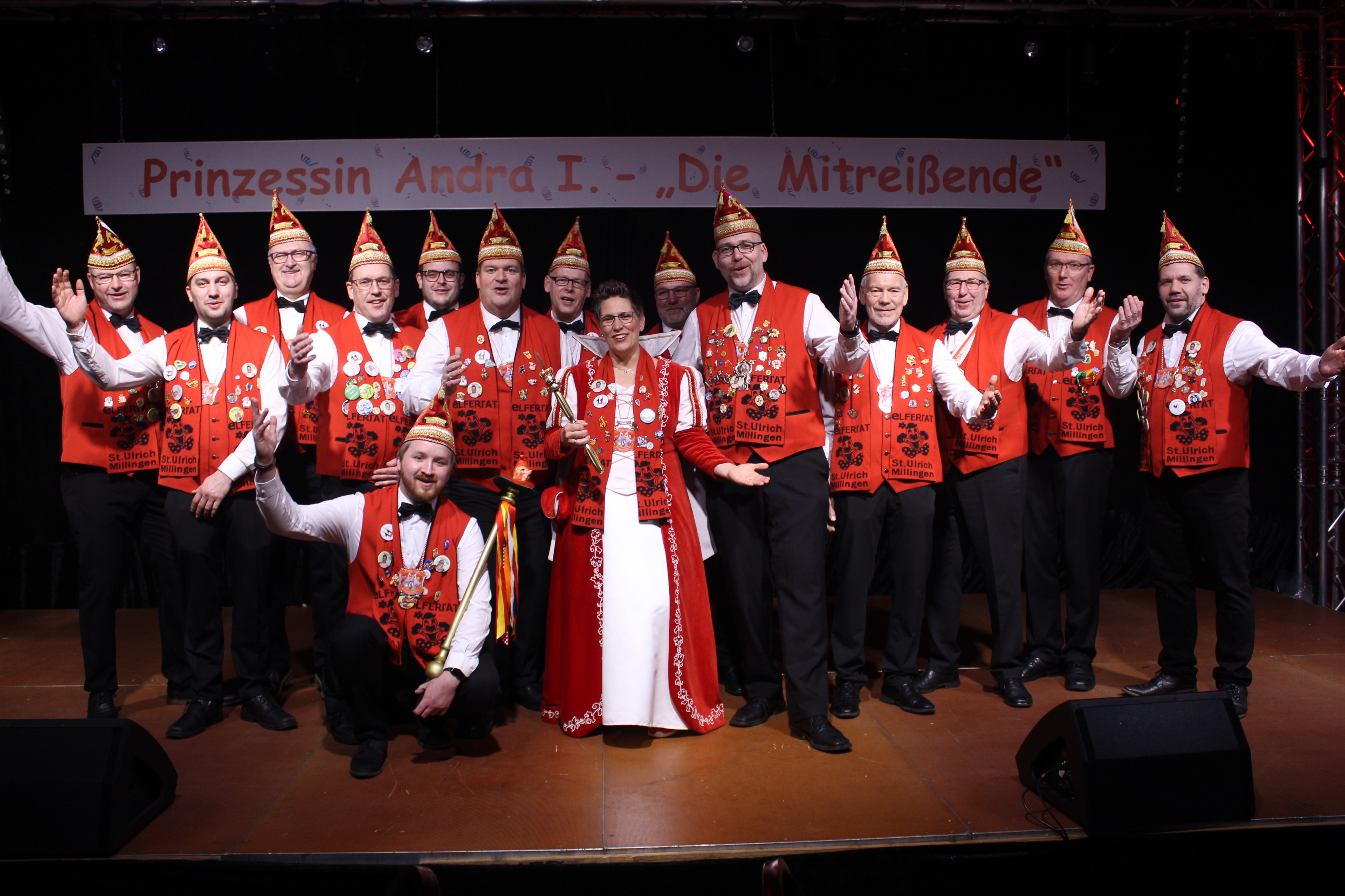 Das Motto der diesjährigen Session prangt über der närrischen Arena des Elferrats St. Ulrich Millingen und zieht sich wie ein roter Faden durch die Büttensitzungen. Jung und Alt, von den Jungschützen bis hin zu den Ehrenmitgliedern, sind dem Ruf der Karnevalisten gefolgt und füllen die Turnhalle der Grundschule am Bienenhaus an beiden Veranstaltungstagen bis zum letzten Platz. Zu Beginn wird die scheidende Prinzessin Sandra II. „Die Schnittige“ von den beiden Sitzungspräsidenten Clemens Sprünken und Normen Grobitsch geehrt und verabschiedet. Dann ist es endlich so weit, das Publikum erhebt sich und mit ihrem Lieblingslied „Man müsste nochmal 20 sein“ erobert Prinzessin Andra I. „Die Mitreißende“ die Bühne und den Saal. Ohne Krönchen, dafür aber mit einem strahlenden Lachen reißt sie das Zepter an sich und hält ihre Rede „Mit Konfetti im Herzen und Karneval im Blut“ vor dem Millinger Narrenvolk. Die Prinzessin, welche „ihr Motto zum Beruf“ gemacht hat und im Labor der Blutspende Duisburg „...das rote Gold überwacht“ ist auch mit Herzblut bei den Millinger Elfies, der Theatergruppe St. Ulrich Millingen und der Sternsingeraktion dabei. Nach der Ordensübergabe an Familie, Freunde und die Ehrengäste startet das bunte Programm, welches wie immer von den Aktiven aus den eigenen Reihen gestaltet wurde.