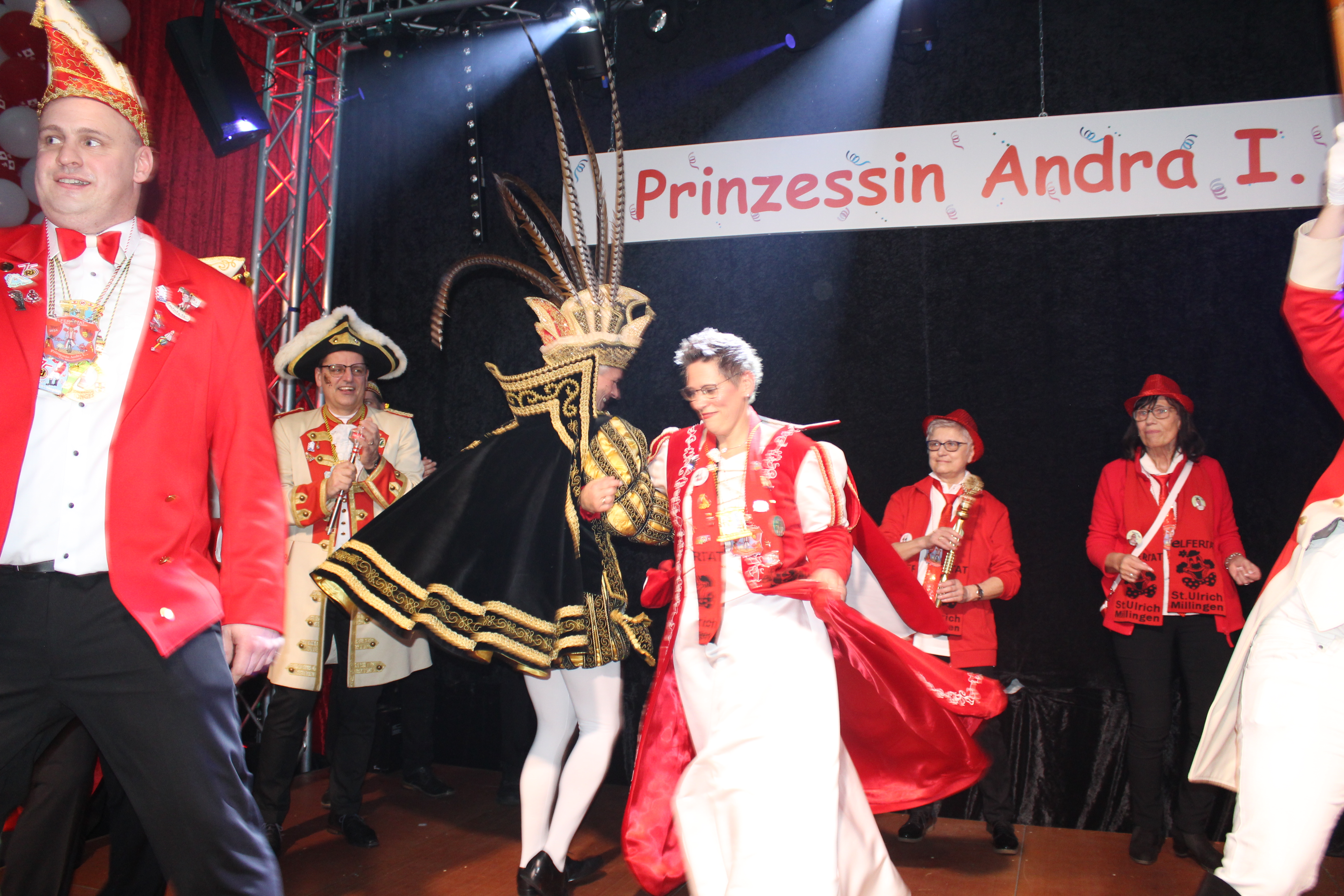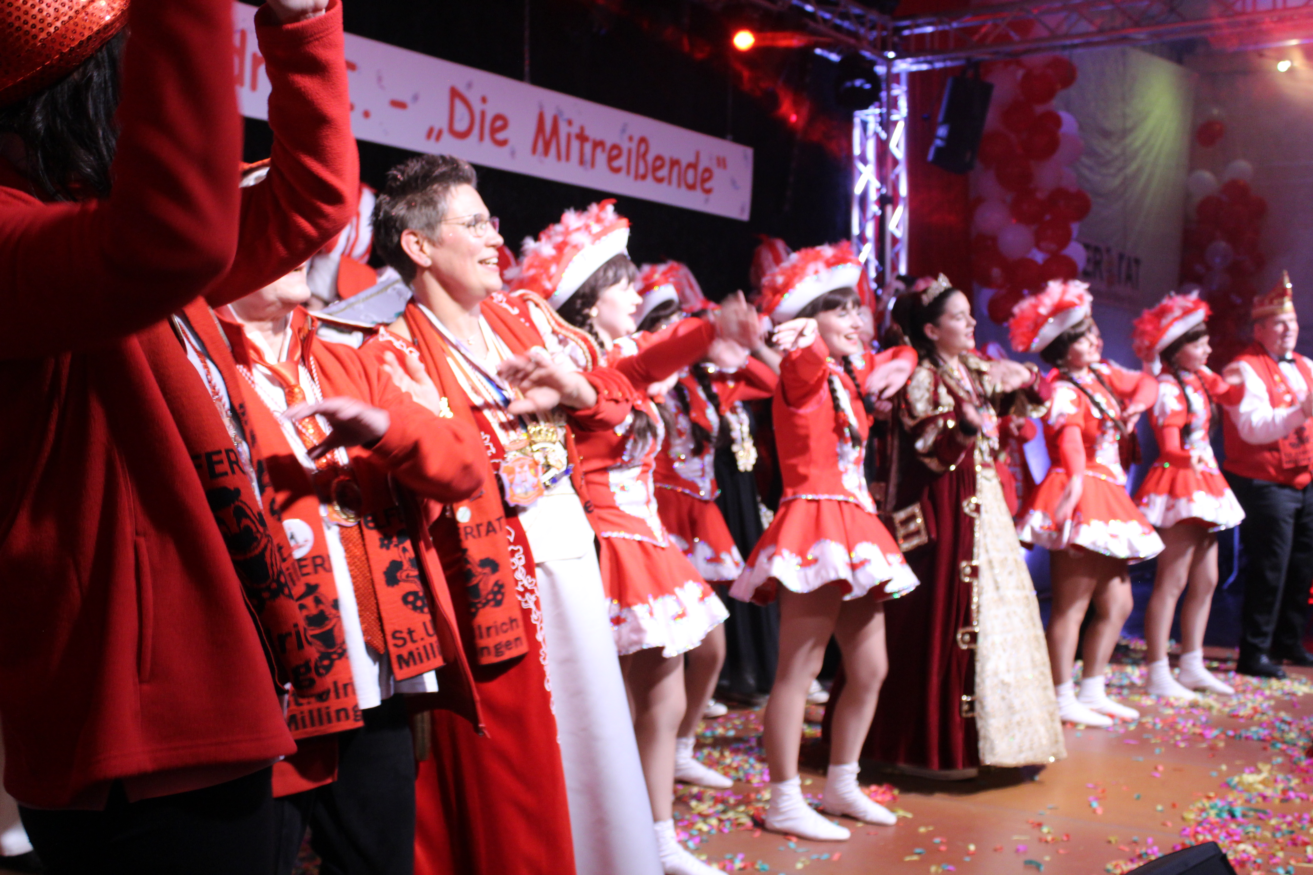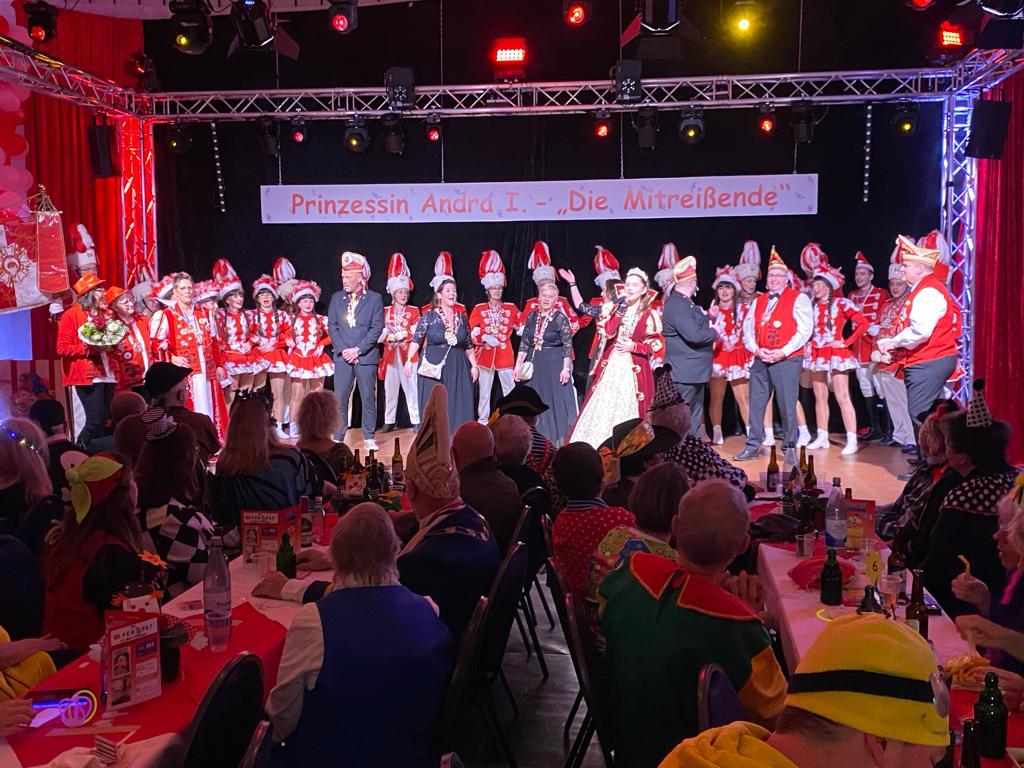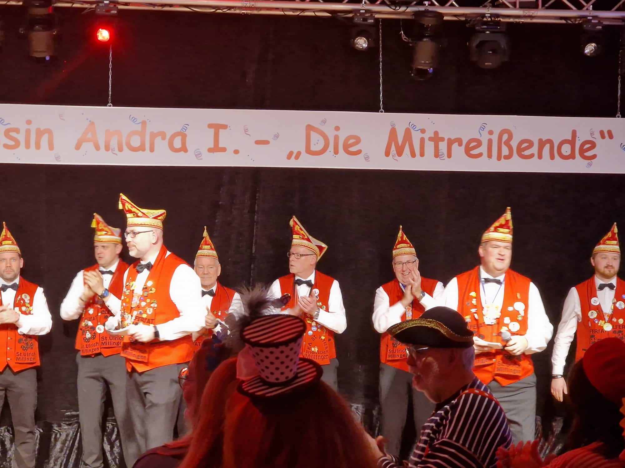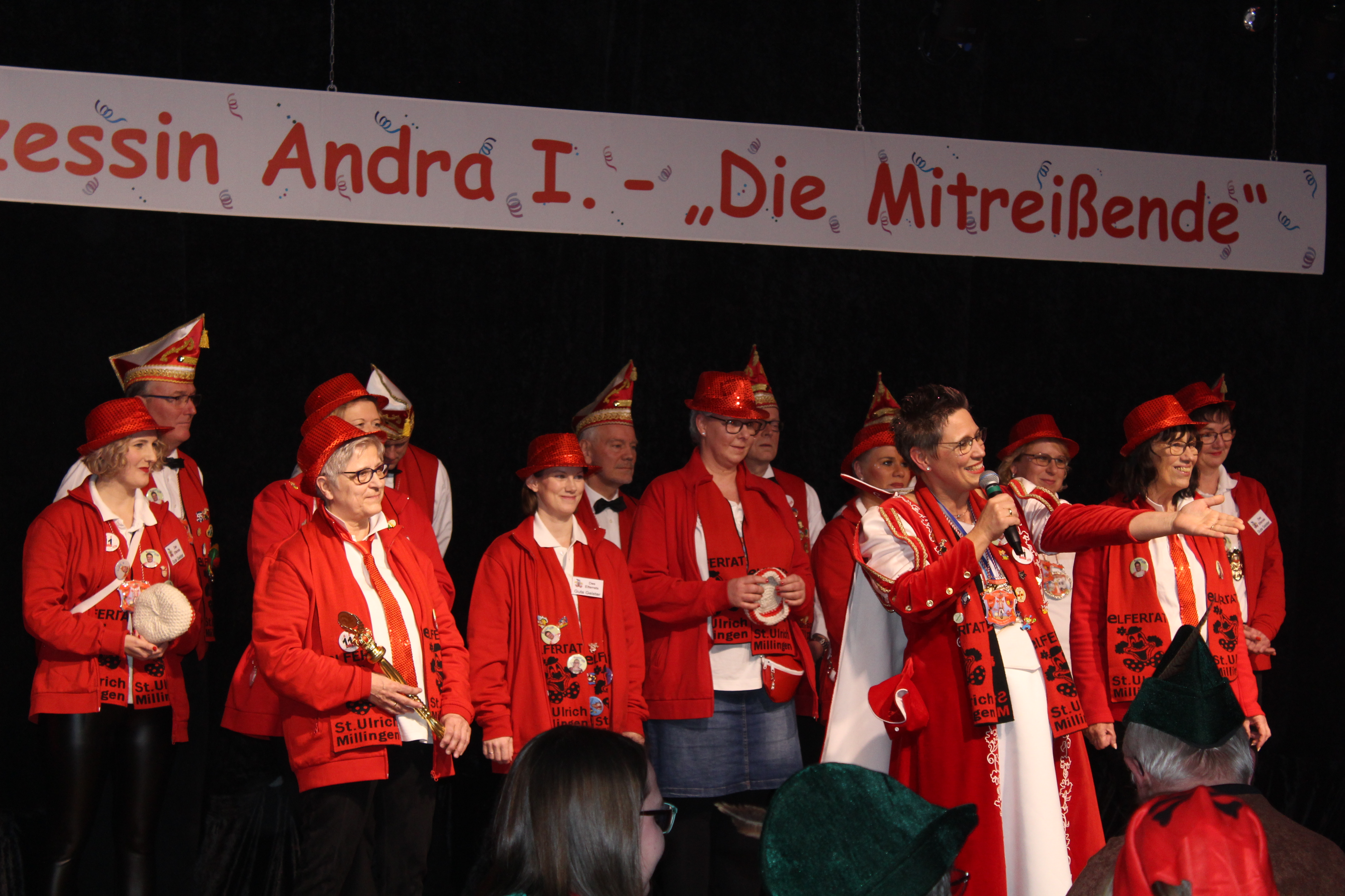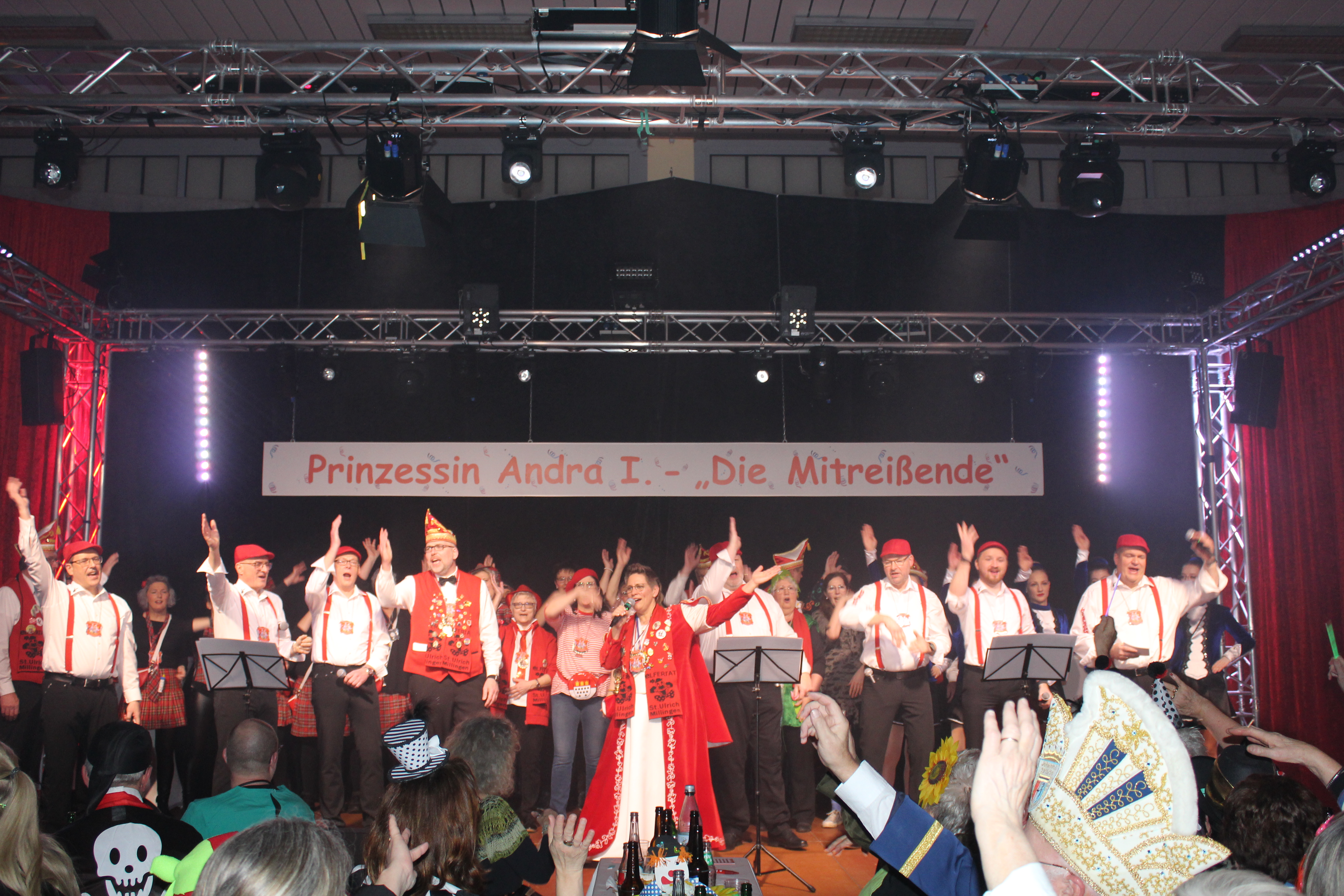 Das Motto der diesjährigen Session prangt über der närrischen Arena des Elferrats St. Ulrich Millingen und zieht sich wie ein roter Faden durch die Büttensitzungen. Jung und Alt, von den Jungschützen bis hin zu den Ehrenmitgliedern, sind dem Ruf der Karnevalisten gefolgt und füllen die Turnhalle der Grundschule am Bienenhaus an beiden Veranstaltungstagen bis zum letzten Platz. Zu Beginn wird die scheidende Prinzessin Sandra II. „Die Schnittige“ von den beiden Sitzungspräsidenten Clemens Sprünken und Normen Grobitsch geehrt und verabschiedet. Dann ist es endlich so weit, das Publikum erhebt sich und mit ihrem Lieblingslied „Man müsste nochmal 20 sein“ erobert Prinzessin Andra I. „Die Mitreißende“ die Bühne und den Saal. Ohne Krönchen, dafür aber mit einem strahlenden Lachen reißt sie das Zepter an sich und hält ihre Rede „Mit Konfetti im Herzen und Karneval im Blut“ vor dem Millinger Narrenvolk. Die Prinzessin, welche „ihr Motto zum Beruf“ gemacht hat und im Labor der Blutspende Duisburg „...das rote Gold überwacht“ ist auch mit Herzblut bei den Millinger Elfies, der Theatergruppe St. Ulrich Millingen und der Sternsingeraktion dabei. Nach der Ordensübergabe an Familie, Freunde und die Ehrengäste startet das bunte Programm, welches wie immer von den Aktiven aus den eigenen Reihen gestaltet wurde.