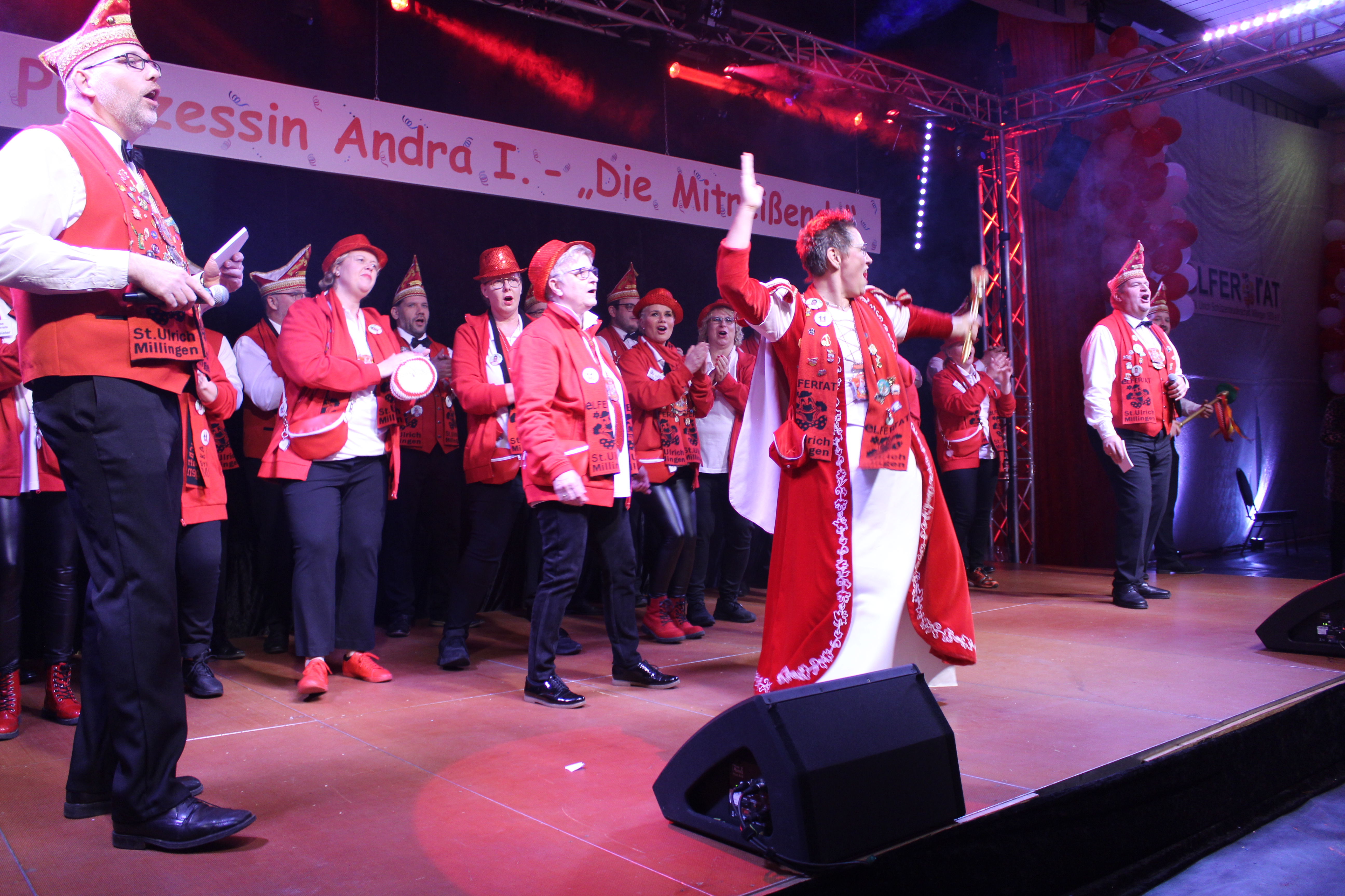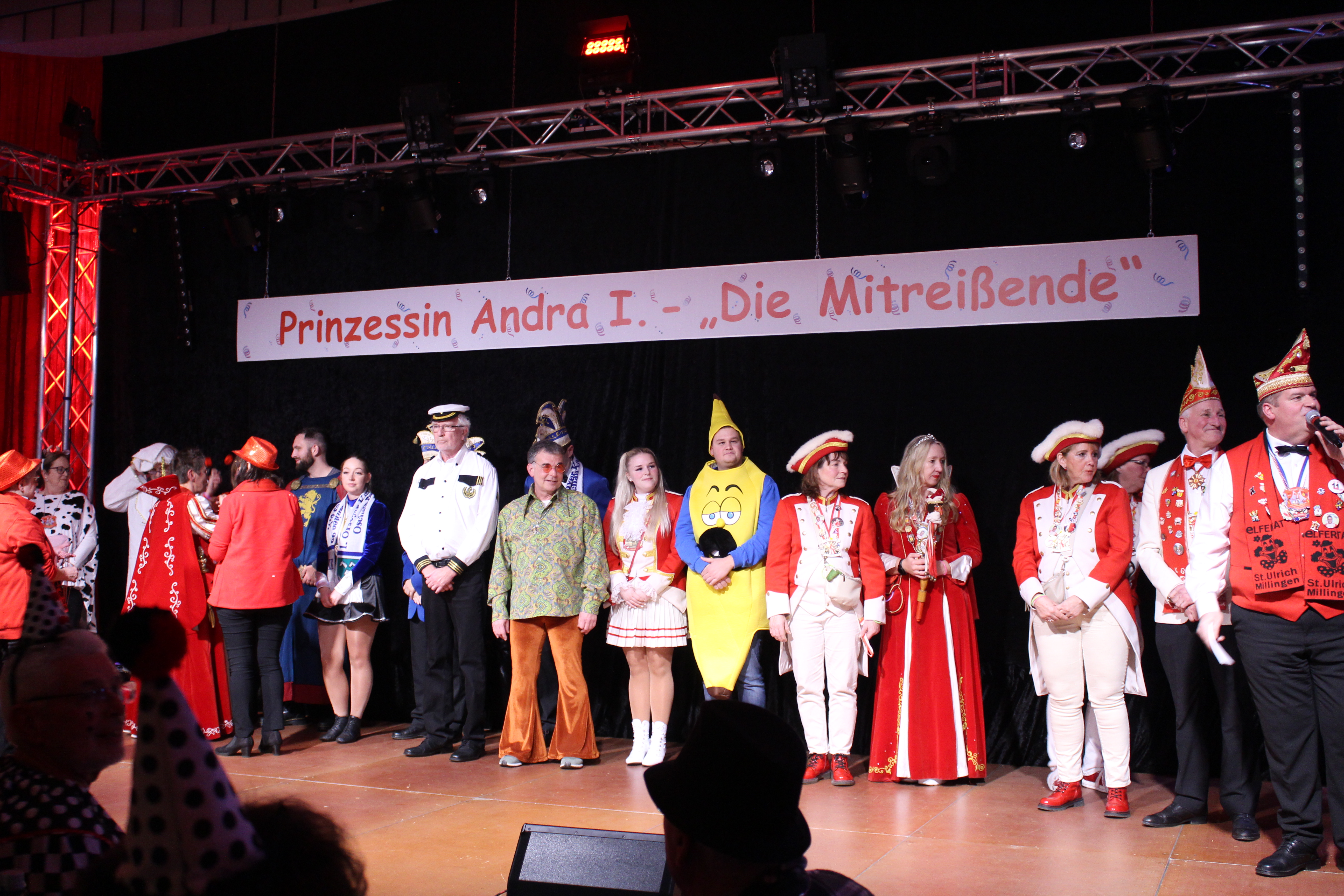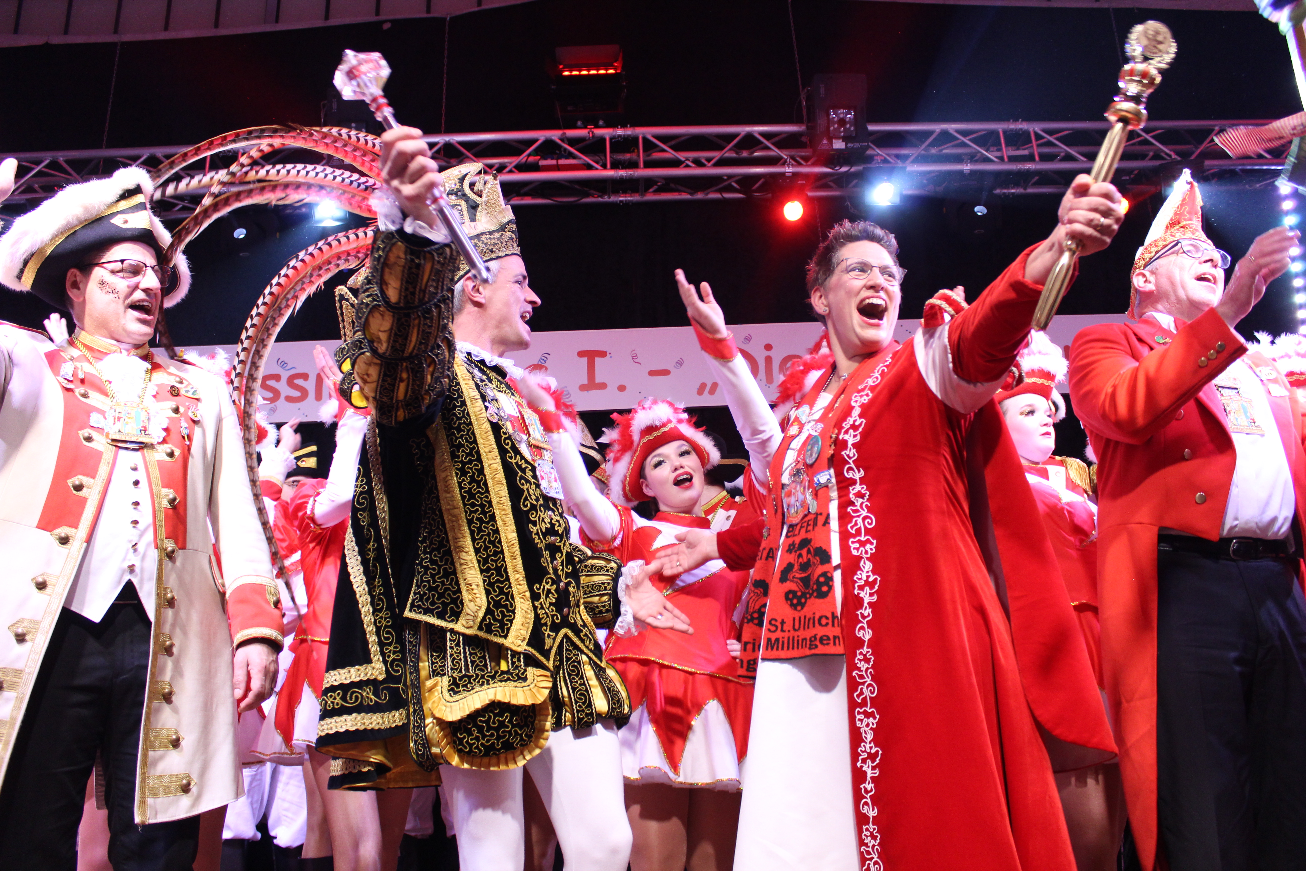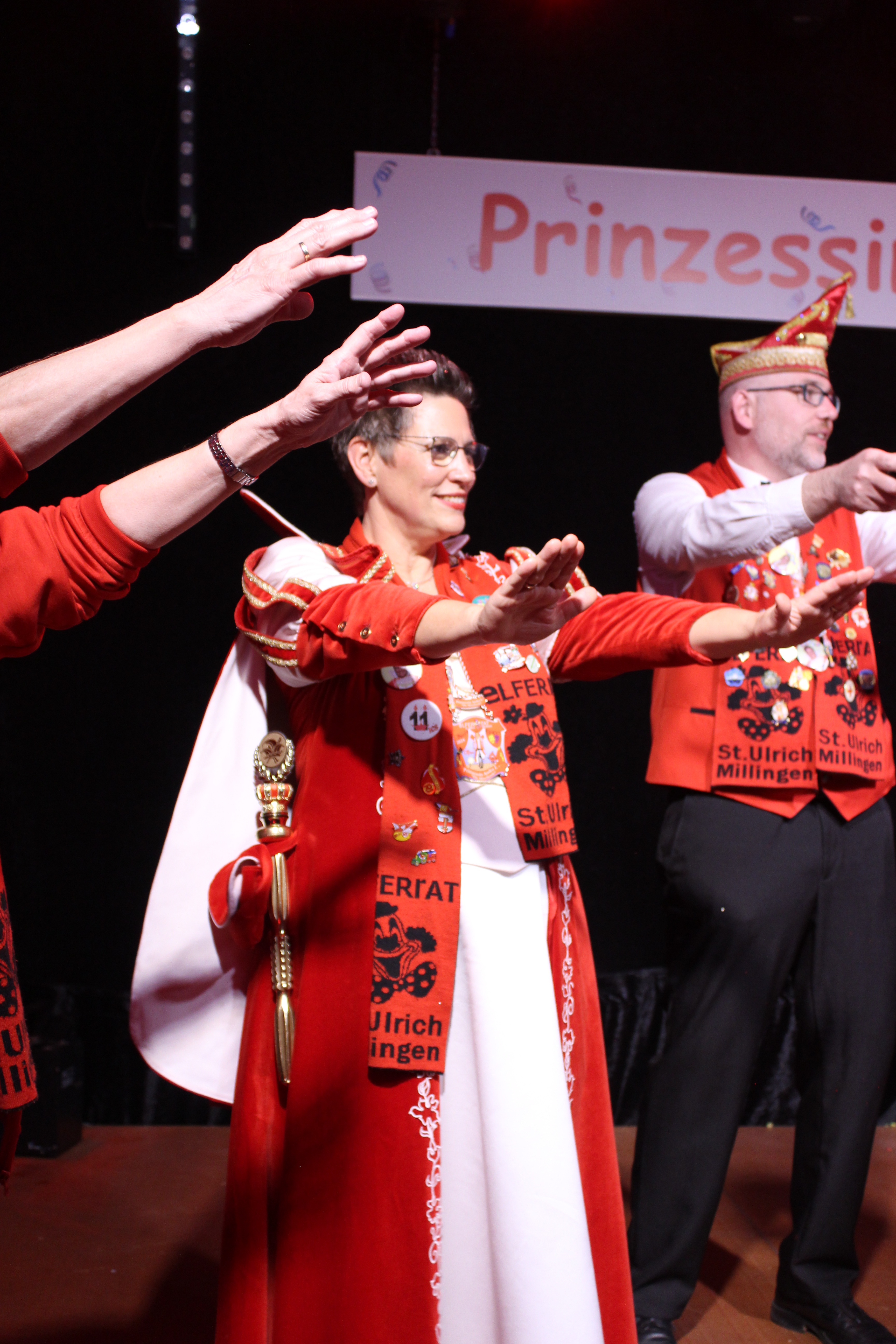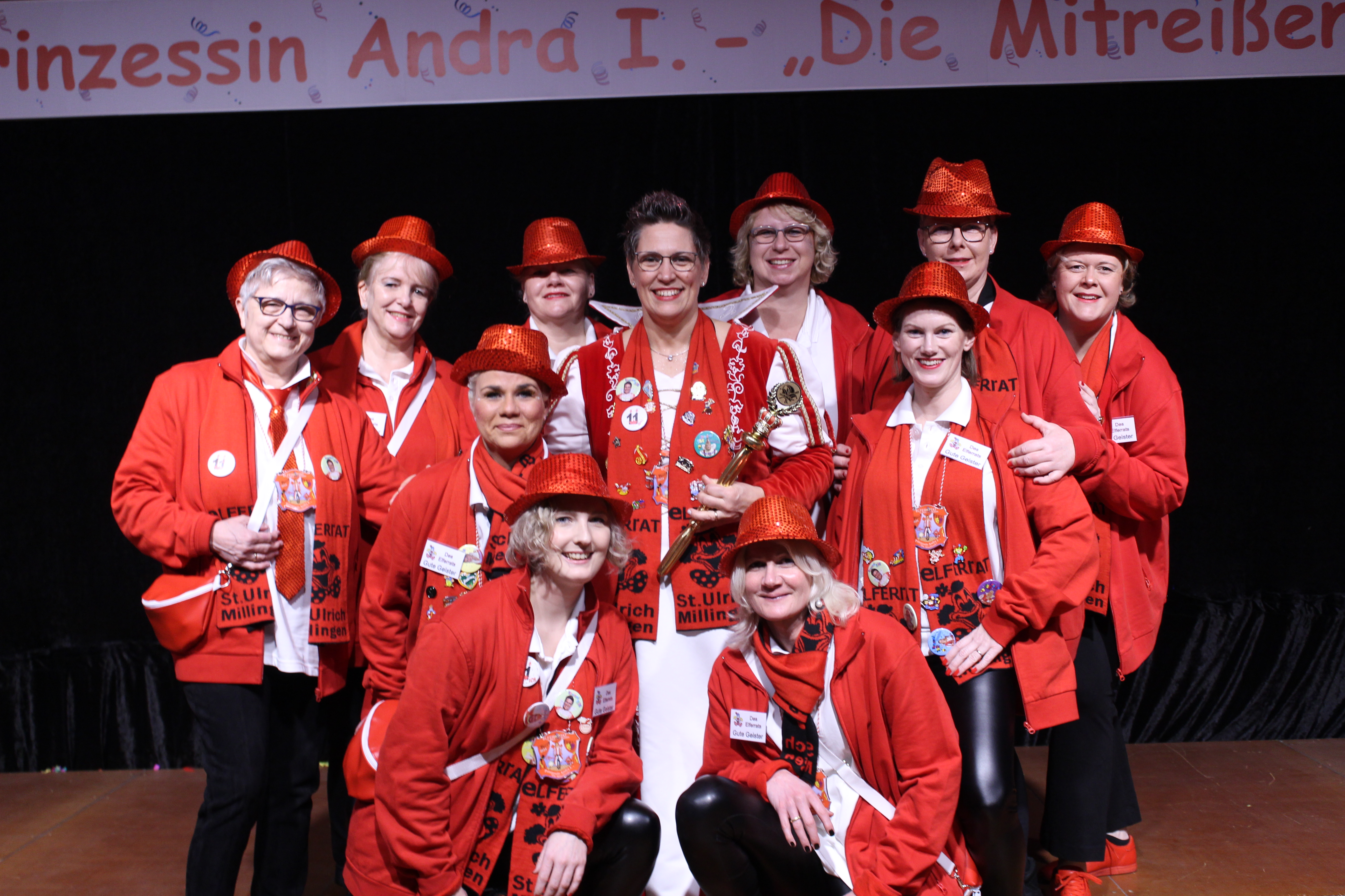 Das Motto der diesjährigen Session prangt über der närrischen Arena des Elferrats St. Ulrich Millingen und zieht sich wie ein roter Faden durch die Büttensitzungen. Jung und Alt, von den Jungschützen bis hin zu den Ehrenmitgliedern, sind dem Ruf der Karnevalisten gefolgt und füllen die Turnhalle der Grundschule am Bienenhaus an beiden Veranstaltungstagen bis zum letzten Platz. Zu Beginn wird die scheidende Prinzessin Sandra II. „Die Schnittige“ von den beiden Sitzungspräsidenten Clemens Sprünken und Normen Grobitsch geehrt und verabschiedet. Dann ist es endlich so weit, das Publikum erhebt sich und mit ihrem Lieblingslied „Man müsste nochmal 20 sein“ erobert Prinzessin Andra I. „Die Mitreißende“ die Bühne und den Saal. Ohne Krönchen, dafür aber mit einem strahlenden Lachen reißt sie das Zepter an sich und hält ihre Rede „Mit Konfetti im Herzen und Karneval im Blut“ vor dem Millinger Narrenvolk. Die Prinzessin, welche „ihr Motto zum Beruf“ gemacht hat und im Labor der Blutspende Duisburg „...das rote Gold überwacht“ ist auch mit Herzblut bei den Millinger Elfies, der Theatergruppe St. Ulrich Millingen und der Sternsingeraktion dabei. Nach der Ordensübergabe an Familie, Freunde und die Ehrengäste startet das bunte Programm, welches wie immer von den Aktiven aus den eigenen Reihen gestaltet wurde.