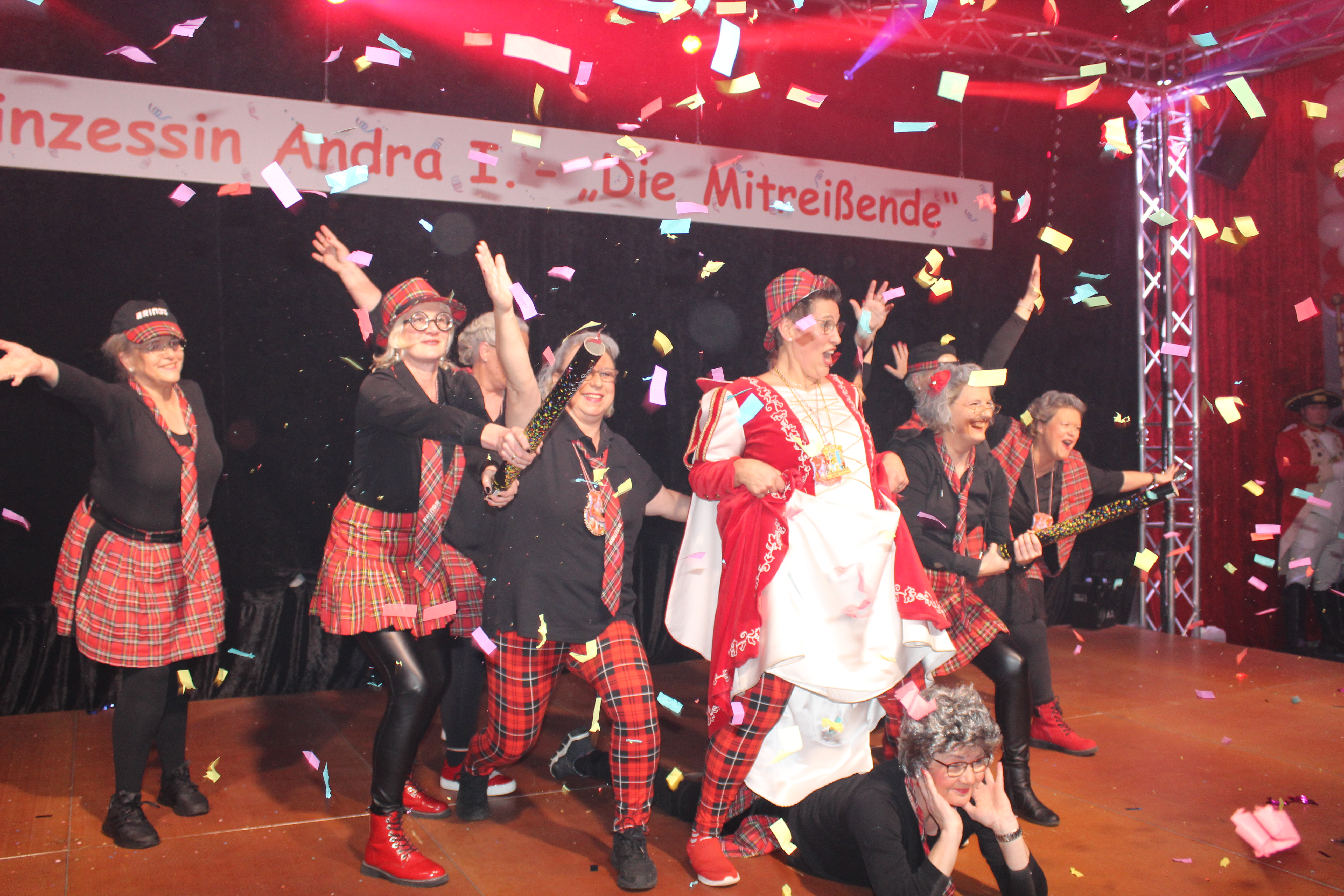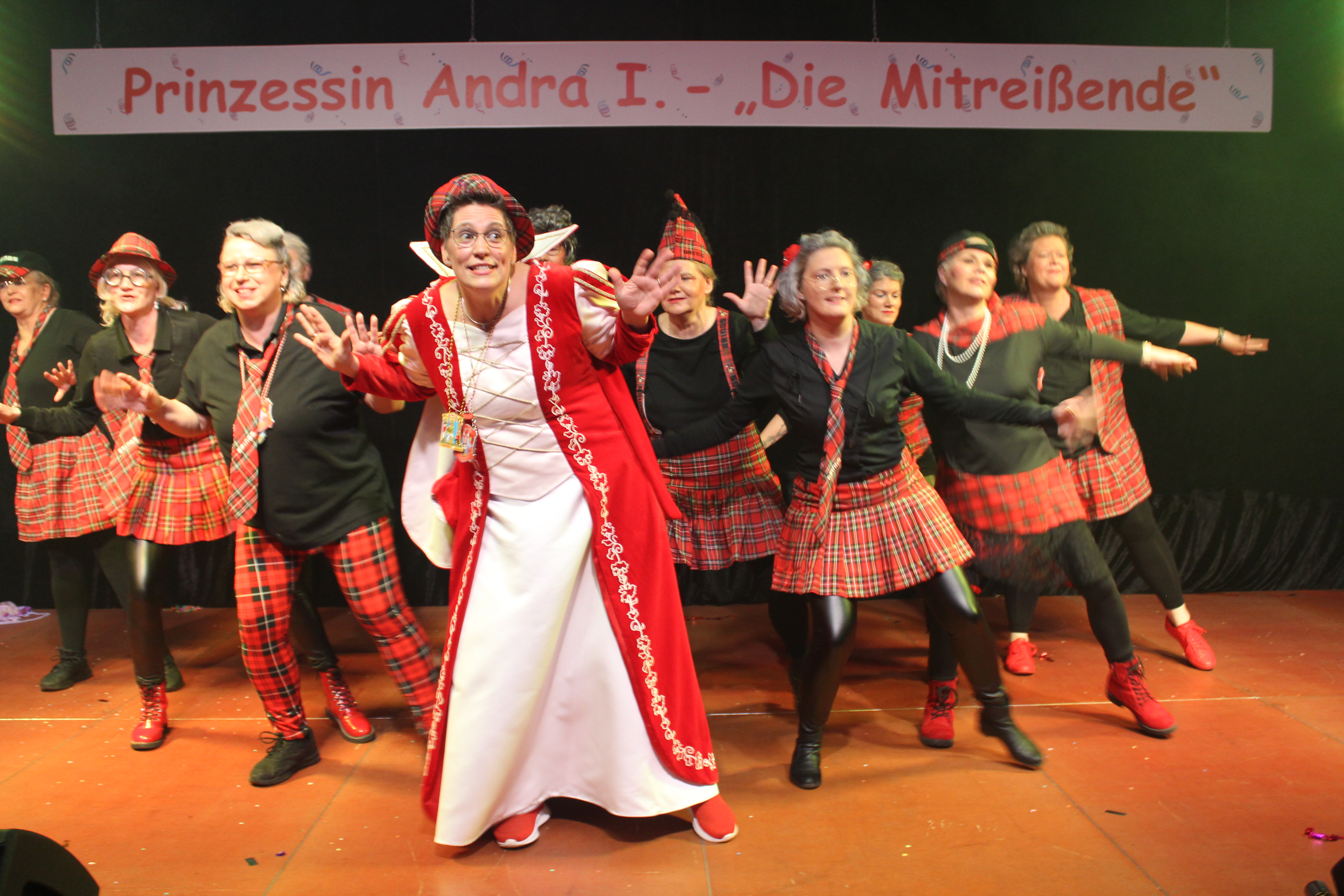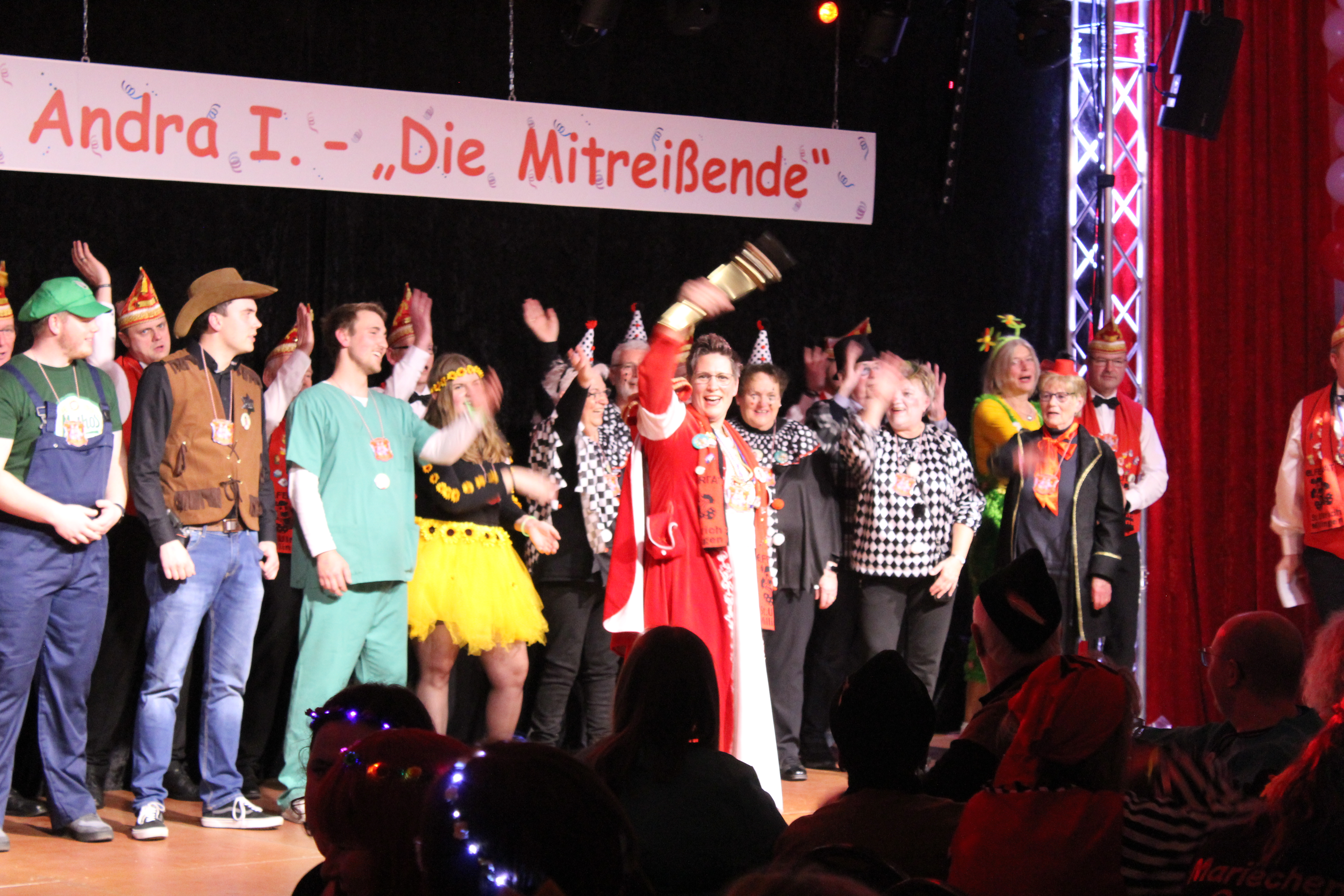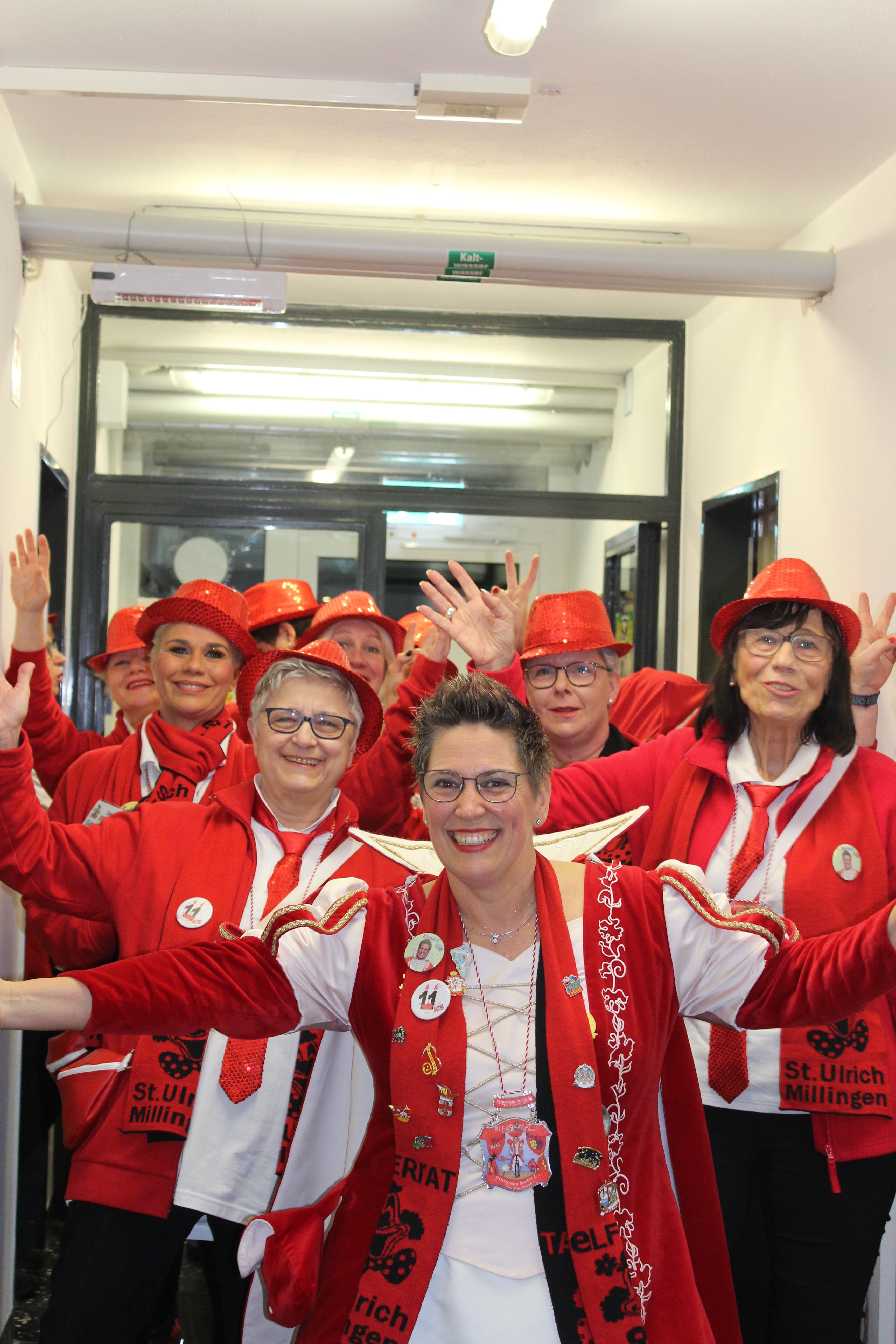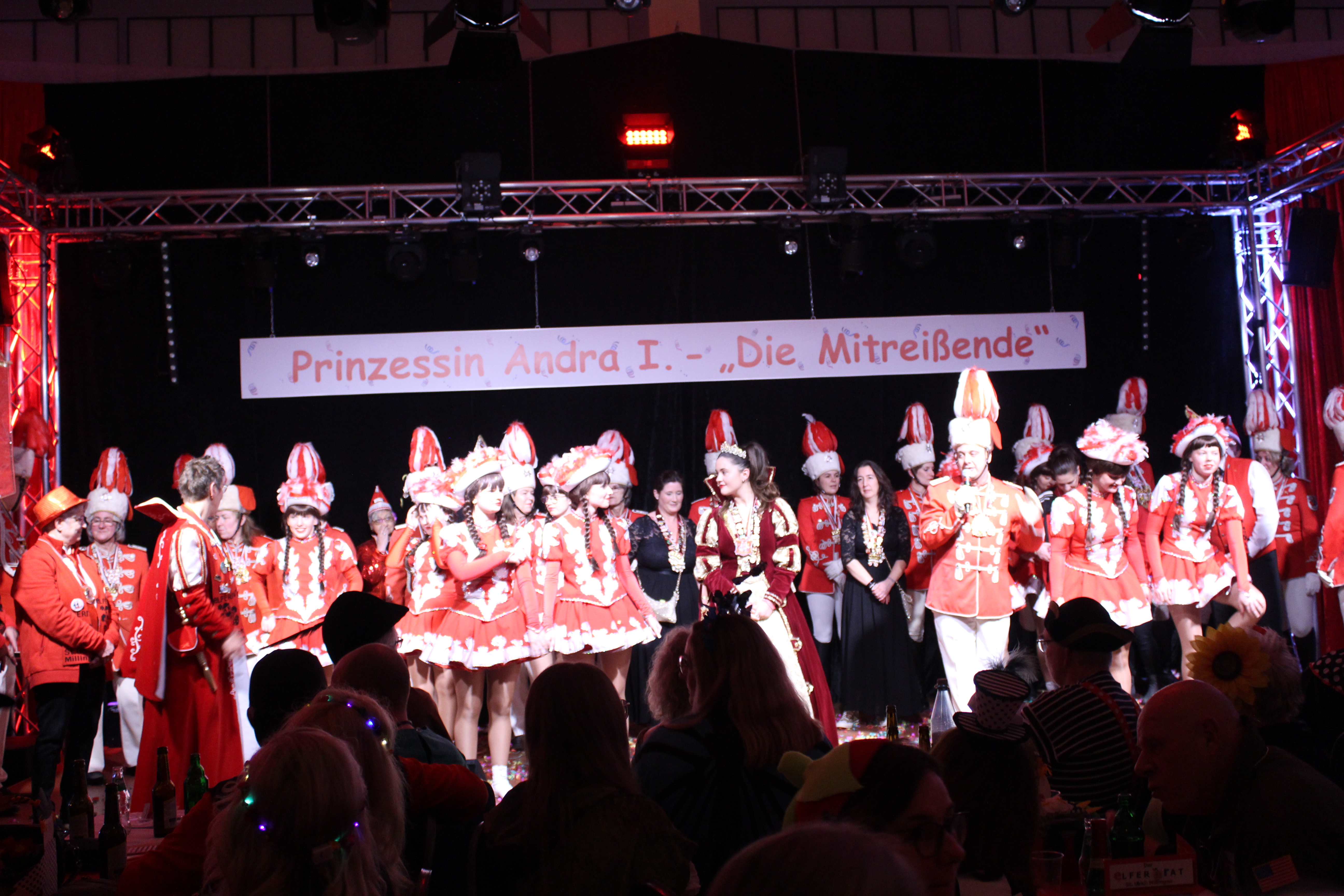Das Motto der diesjährigen Session prangt über der närrischen Arena des Elferrats St. Ulrich Millingen und zieht sich wie ein roter Faden durch die Büttensitzungen. Jung und Alt, von den Jungschützen bis hin zu den Ehrenmitgliedern, sind dem Ruf der Karnevalisten gefolgt und füllen die Turnhalle der Grundschule am Bienenhaus an beiden Veranstaltungstagen bis zum letzten Platz. Zu Beginn wird die scheidende Prinzessin Sandra II. „Die Schnittige“ von den beiden Sitzungspräsidenten Clemens Sprünken und Normen Grobitsch geehrt und verabschiedet. Dann ist es endlich so weit, das Publikum erhebt sich und mit ihrem Lieblingslied „Man müsste nochmal 20 sein“ erobert Prinzessin Andra I. „Die Mitreißende“ die Bühne und den Saal. Ohne Krönchen, dafür aber mit einem strahlenden Lachen reißt sie das Zepter an sich und hält ihre Rede „Mit Konfetti im Herzen und Karneval im Blut“ vor dem Millinger Narrenvolk. Die Prinzessin, welche „ihr Motto zum Beruf“ gemacht hat und im Labor der Blutspende Duisburg „...das rote Gold überwacht“ ist auch mit Herzblut bei den Millinger Elfies, der Theatergruppe St. Ulrich Millingen und der Sternsingeraktion dabei. Nach der Ordensübergabe an Familie, Freunde und die Ehrengäste startet das bunte Programm, welches wie immer von den Aktiven aus den eigenen Reihen gestaltet wurde.