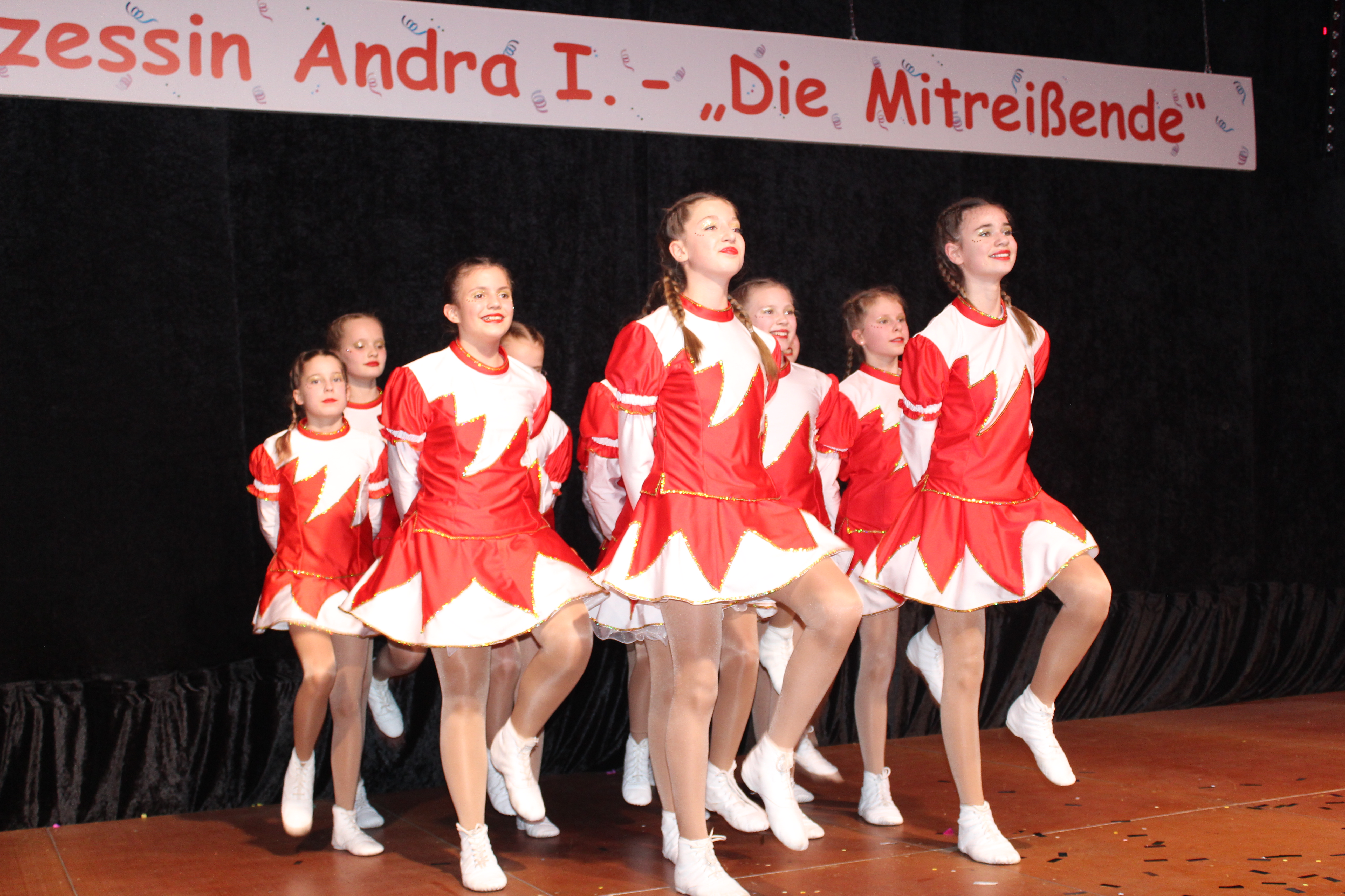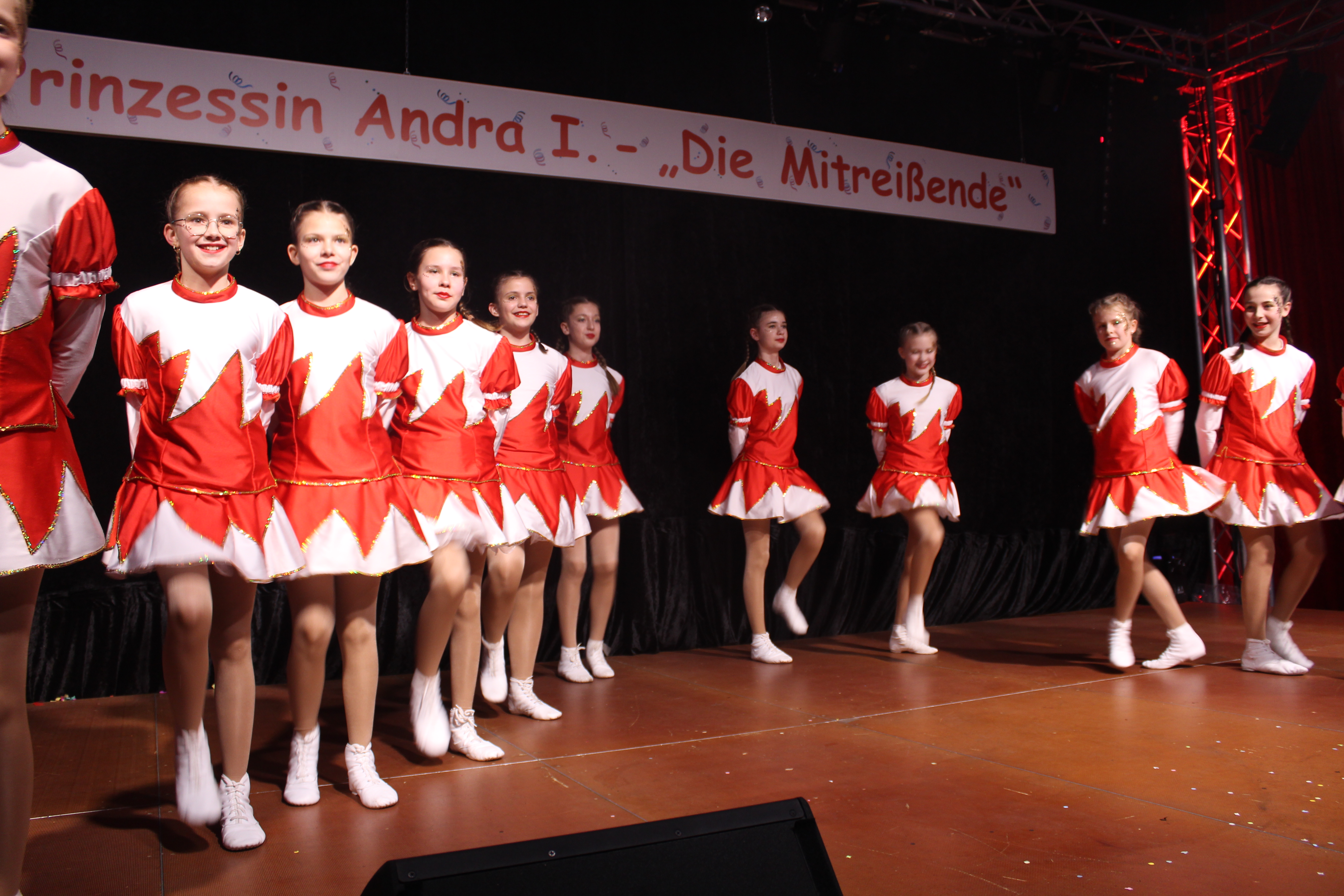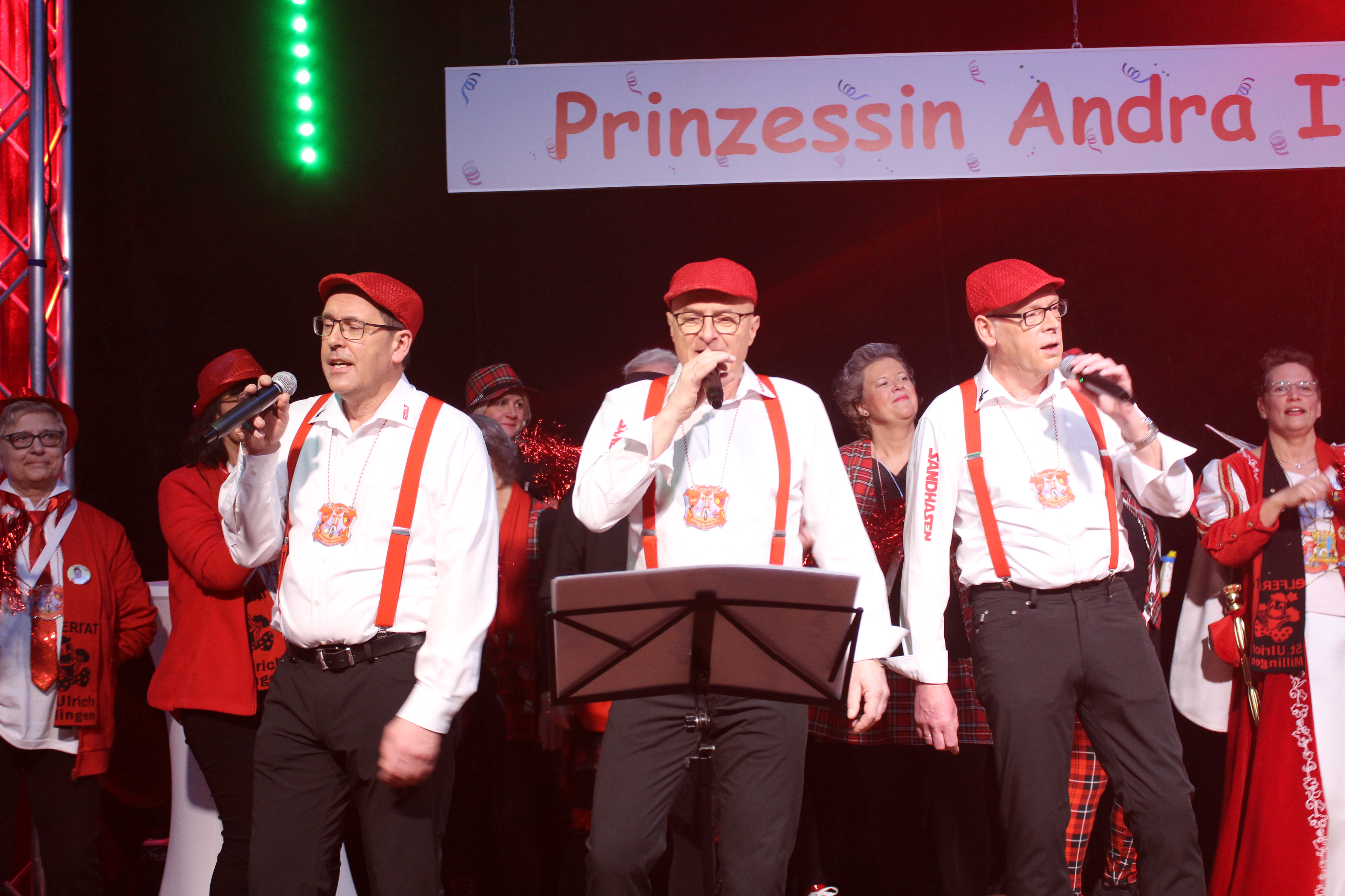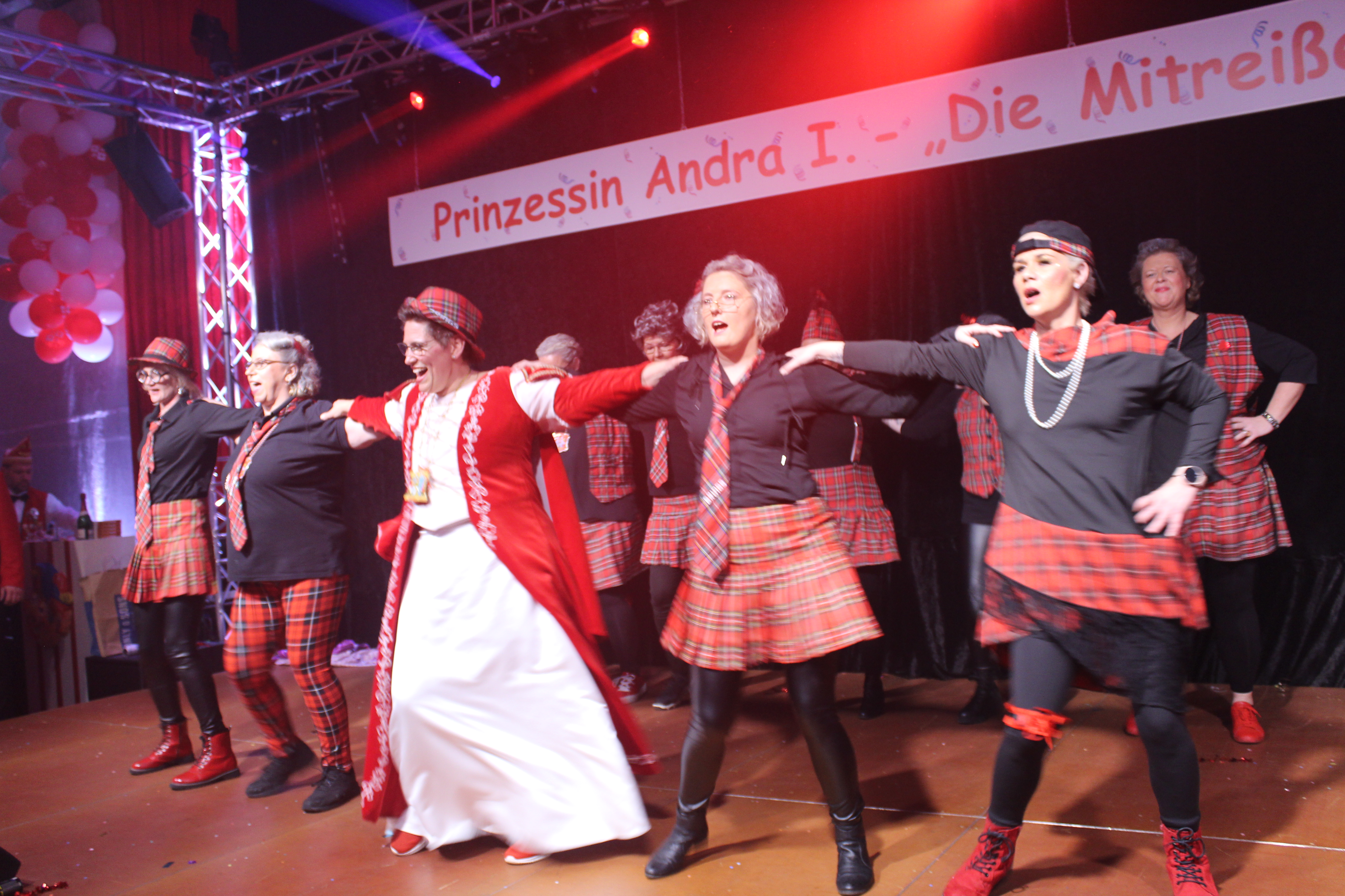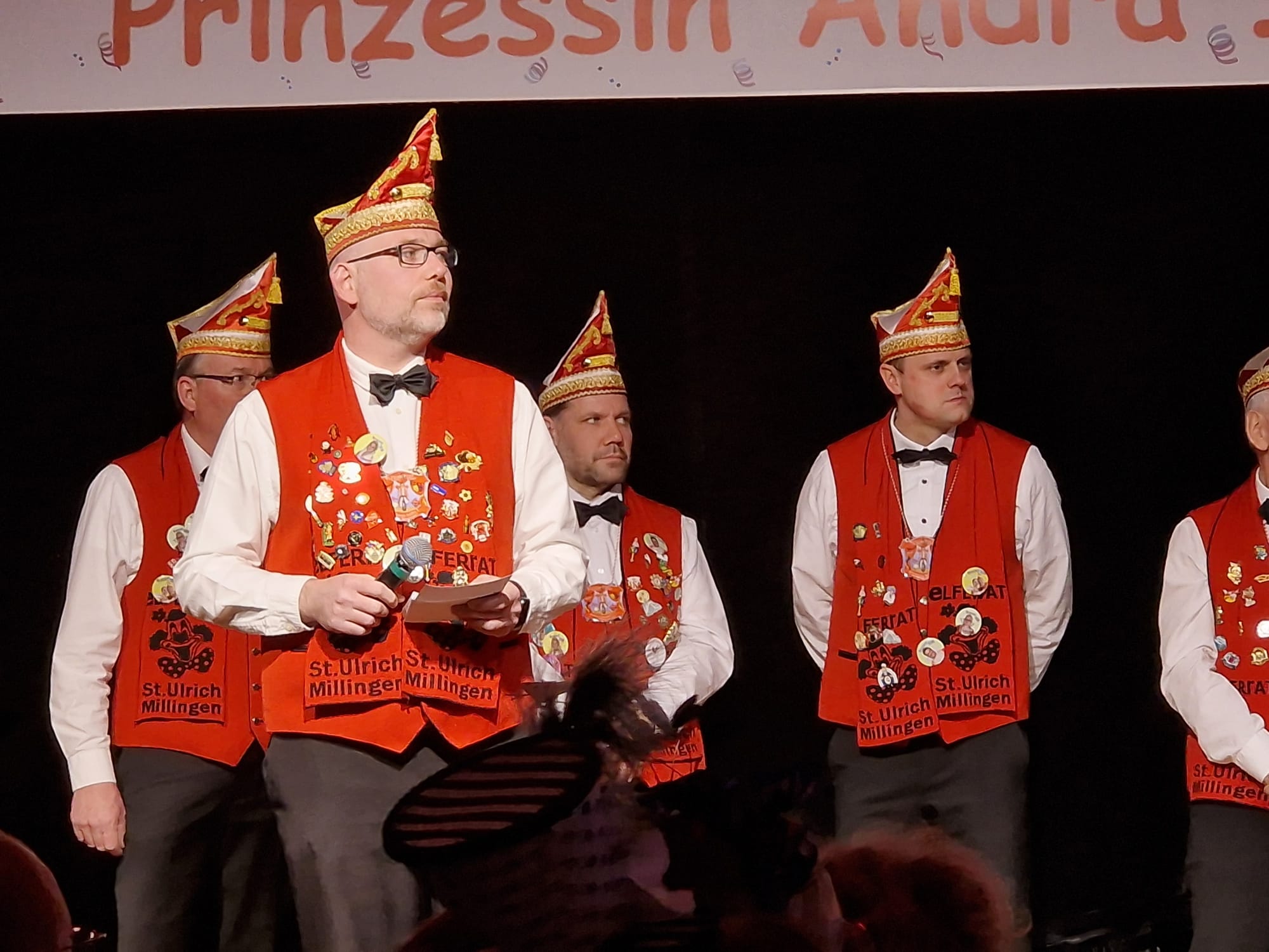 Das Motto der diesjährigen Session prangt über der närrischen Arena des Elferrats St. Ulrich Millingen und zieht sich wie ein roter Faden durch die Büttensitzungen. Jung und Alt, von den Jungschützen bis hin zu den Ehrenmitgliedern, sind dem Ruf der Karnevalisten gefolgt und füllen die Turnhalle der Grundschule am Bienenhaus an beiden Veranstaltungstagen bis zum letzten Platz. Zu Beginn wird die scheidende Prinzessin Sandra II. „Die Schnittige“ von den beiden Sitzungspräsidenten Clemens Sprünken und Normen Grobitsch geehrt und verabschiedet. Dann ist es endlich so weit, das Publikum erhebt sich und mit ihrem Lieblingslied „Man müsste nochmal 20 sein“ erobert Prinzessin Andra I. „Die Mitreißende“ die Bühne und den Saal. Ohne Krönchen, dafür aber mit einem strahlenden Lachen reißt sie das Zepter an sich und hält ihre Rede „Mit Konfetti im Herzen und Karneval im Blut“ vor dem Millinger Narrenvolk. Die Prinzessin, welche „ihr Motto zum Beruf“ gemacht hat und im Labor der Blutspende Duisburg „...das rote Gold überwacht“ ist auch mit Herzblut bei den Millinger Elfies, der Theatergruppe St. Ulrich Millingen und der Sternsingeraktion dabei. Nach der Ordensübergabe an Familie, Freunde und die Ehrengäste startet das bunte Programm, welches wie immer von den Aktiven aus den eigenen Reihen gestaltet wurde.