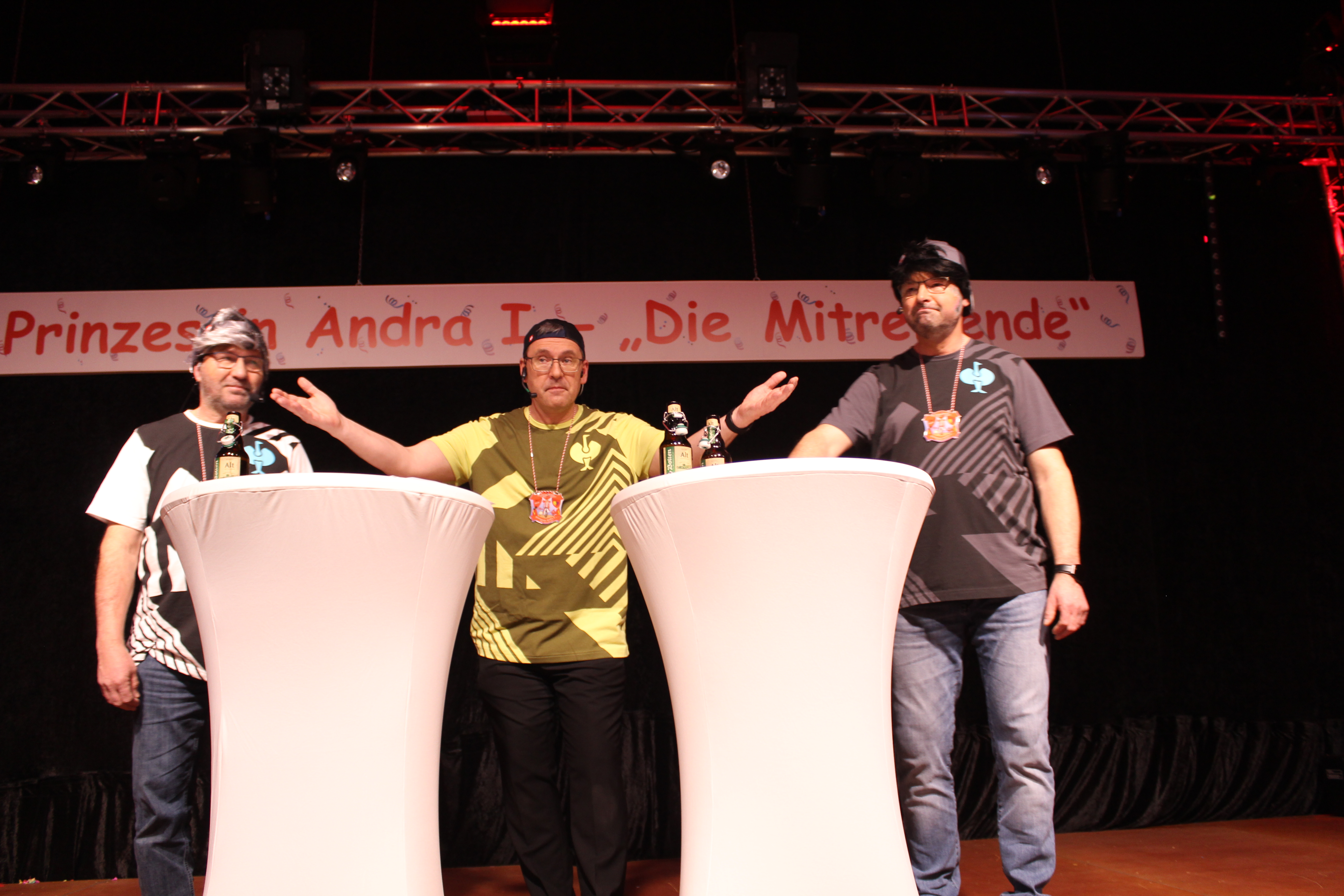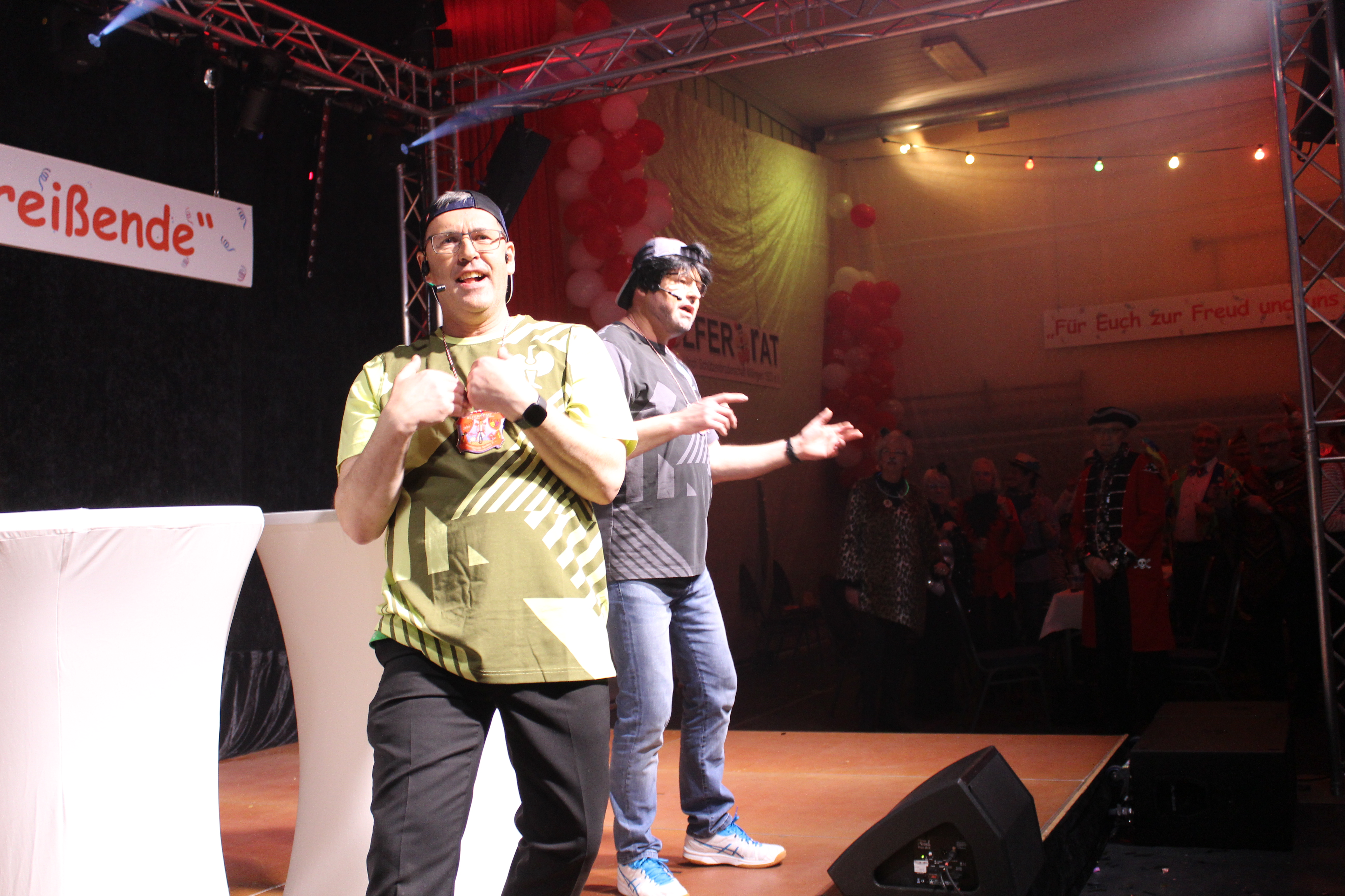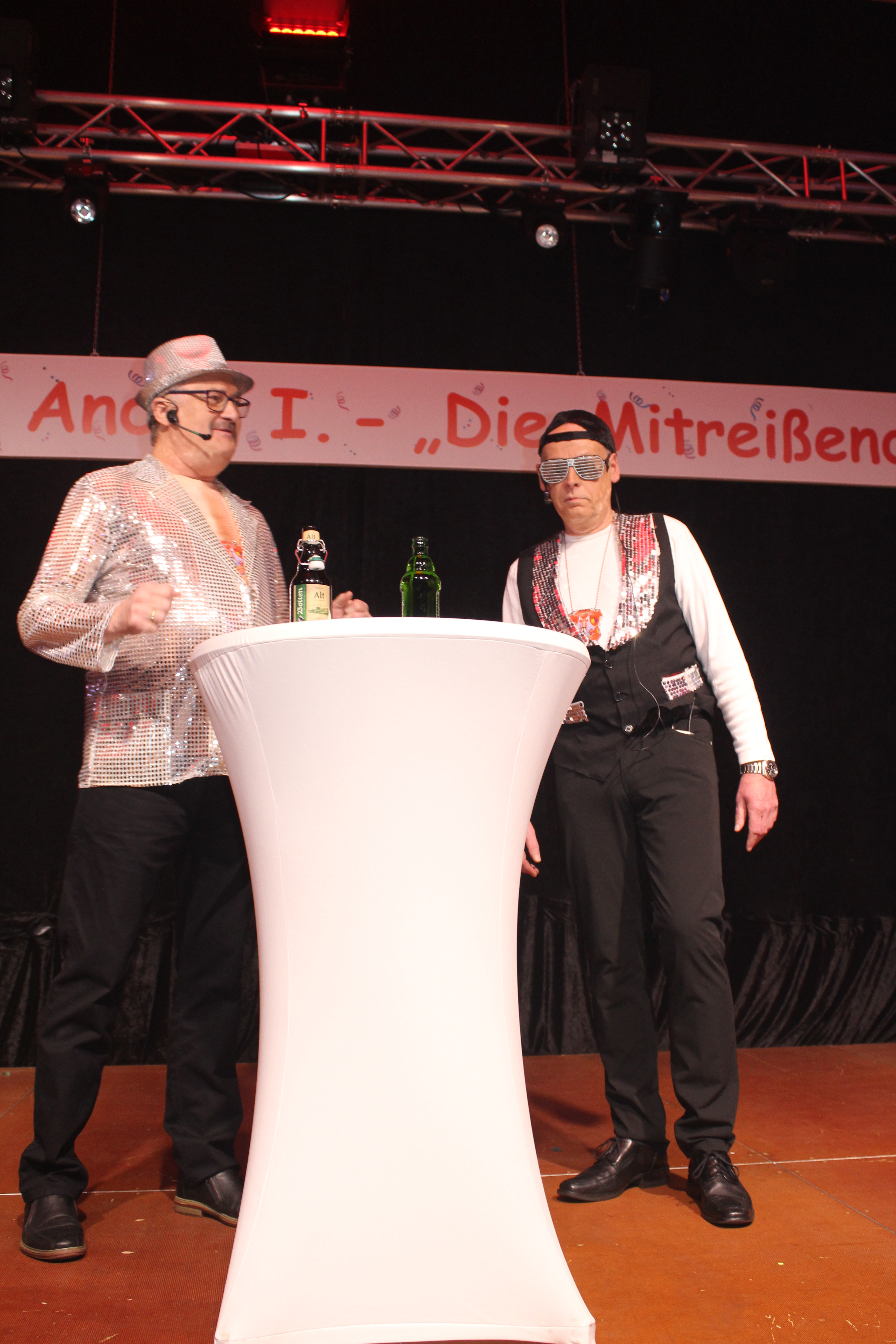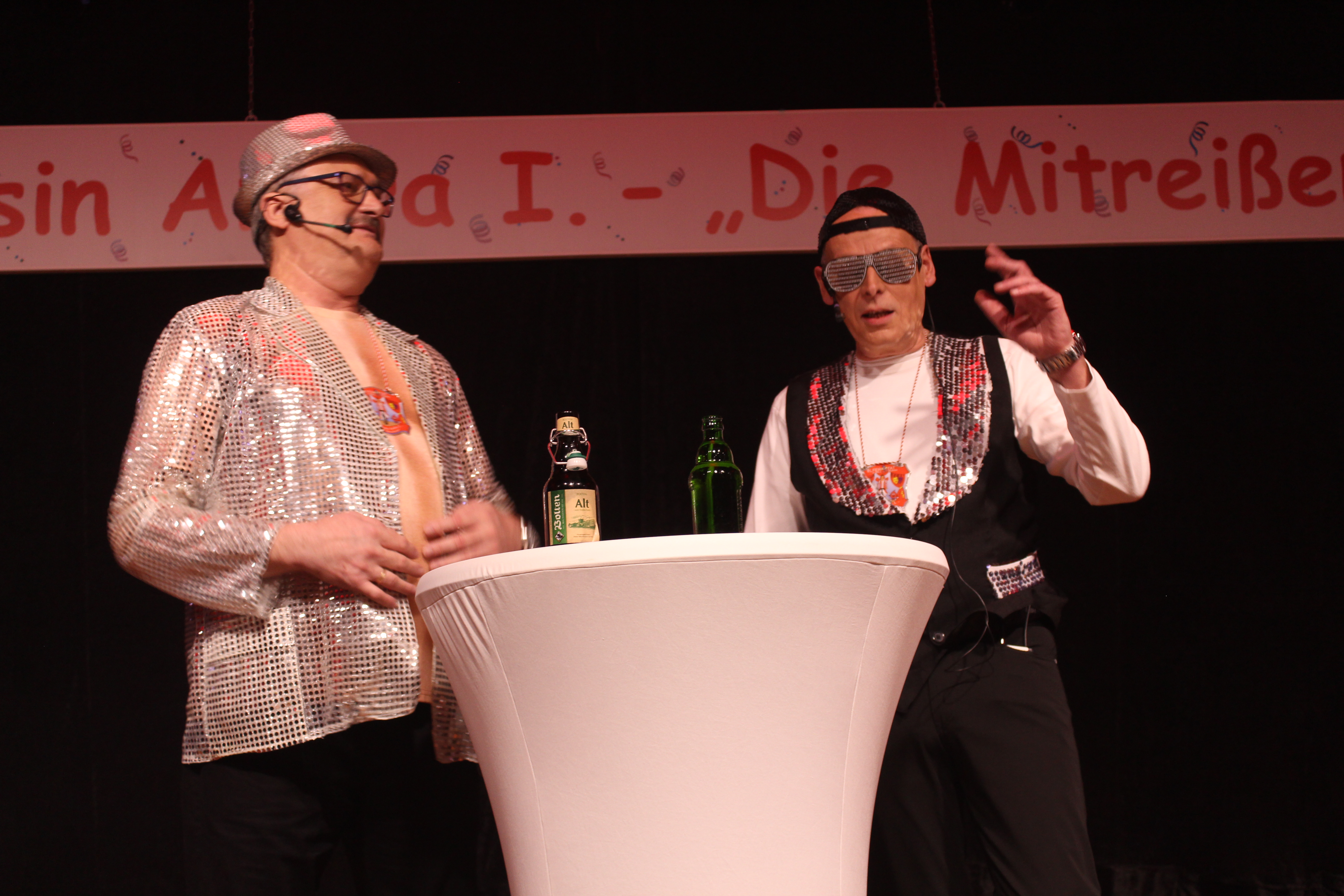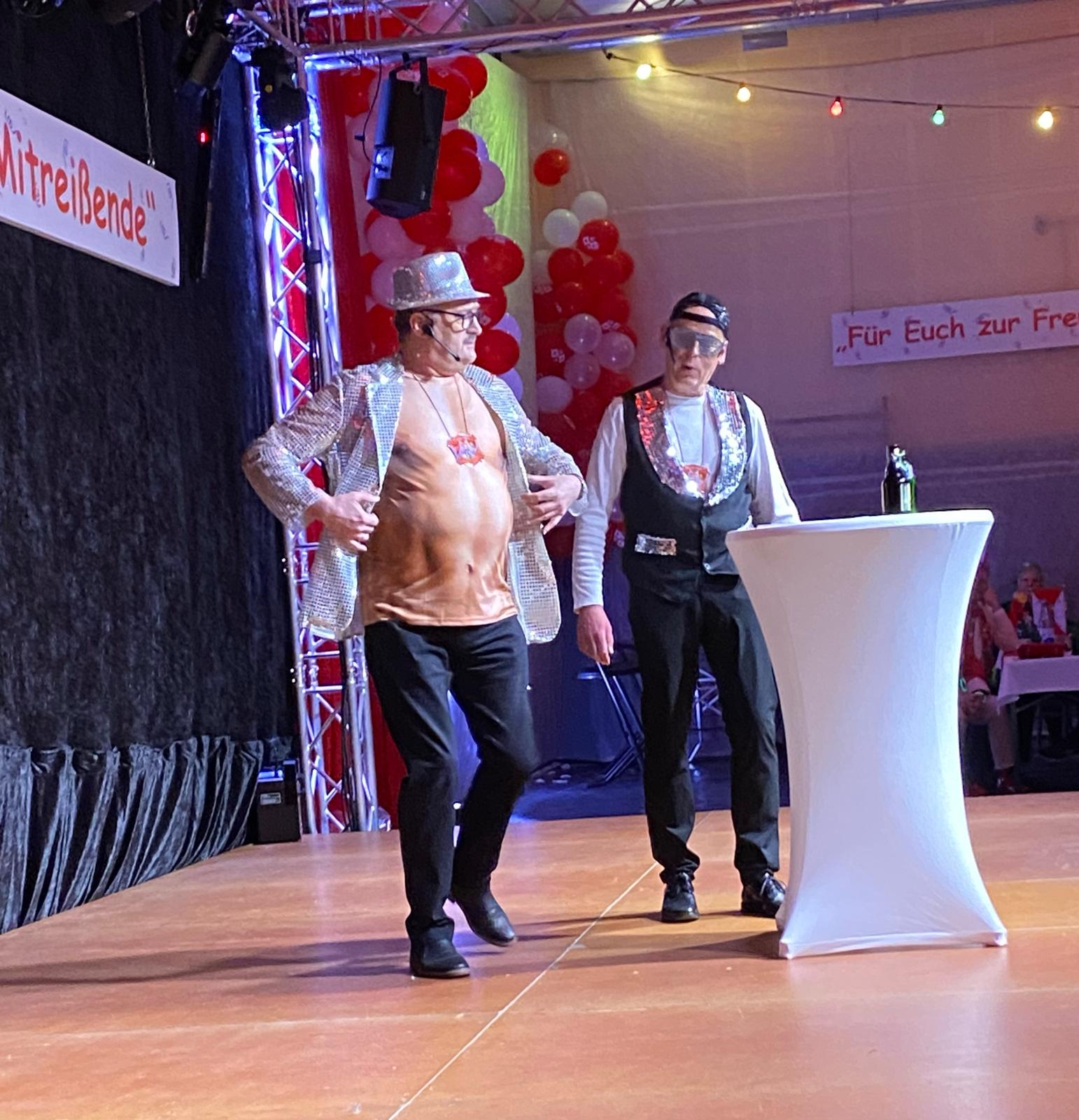 Als ungewollter Ruheständler eröffnet Mario Heinen den Reigen und erntet mit seiner gereimten, spitzfindigen Rede viel Applaus. Eine kleine Schaffenspause gönnten sich Thomas Coenen und Detlef Scholz, um in diesem Jahr wieder als „Bissig und Schön“ auf der Bühne zu stehen und sich einen bissigen, teils schlüpfrigen Schlagabtausch zu liefern.