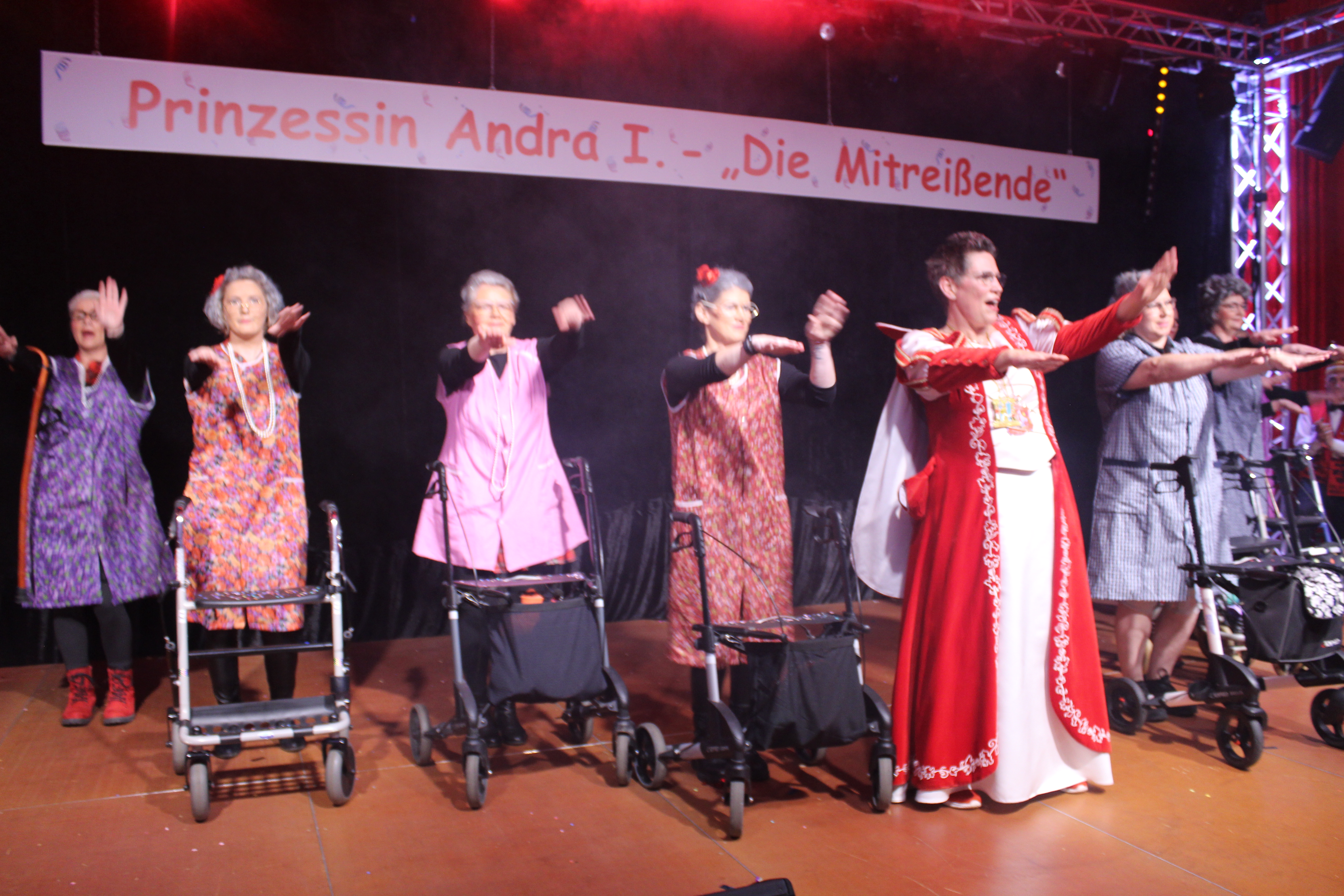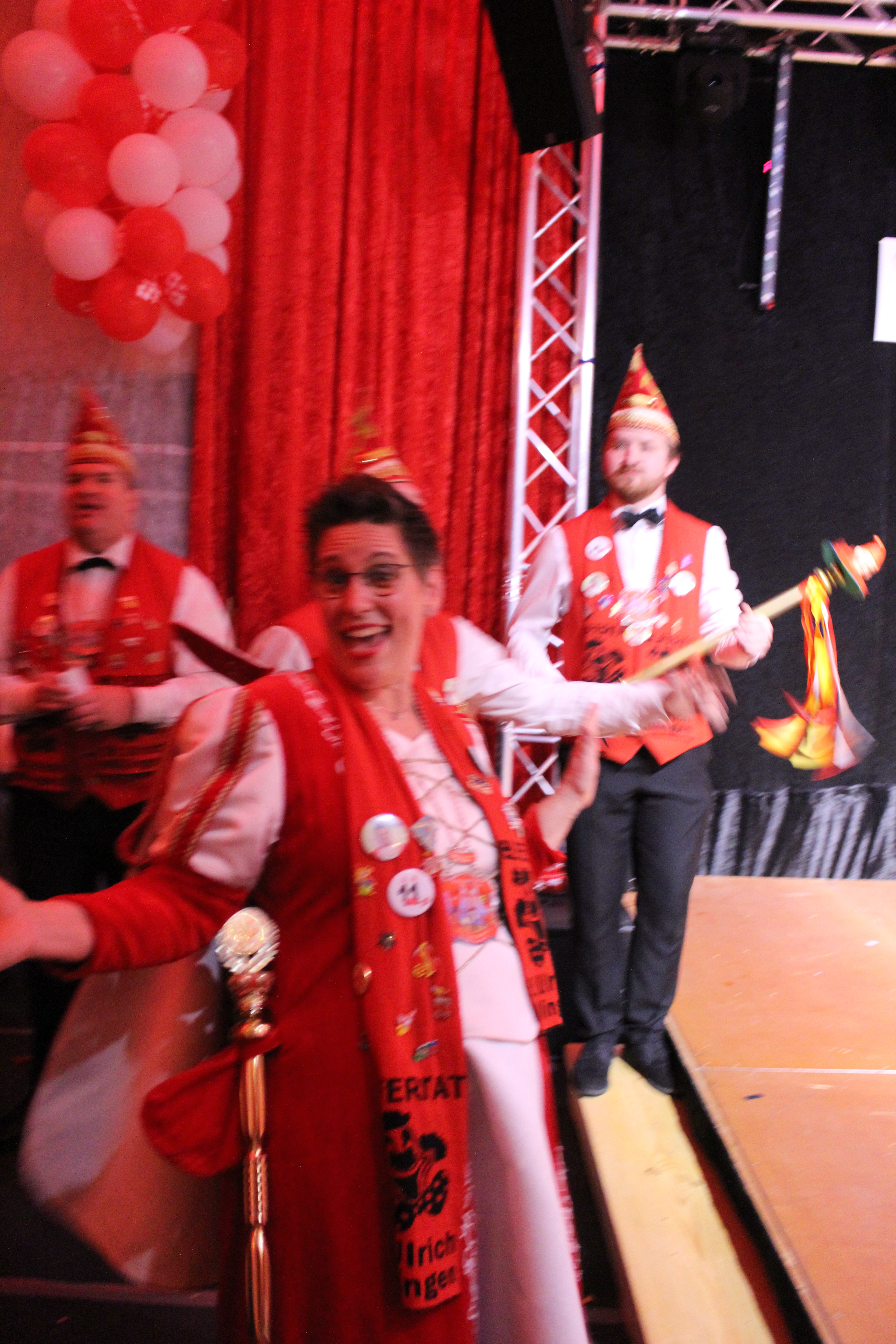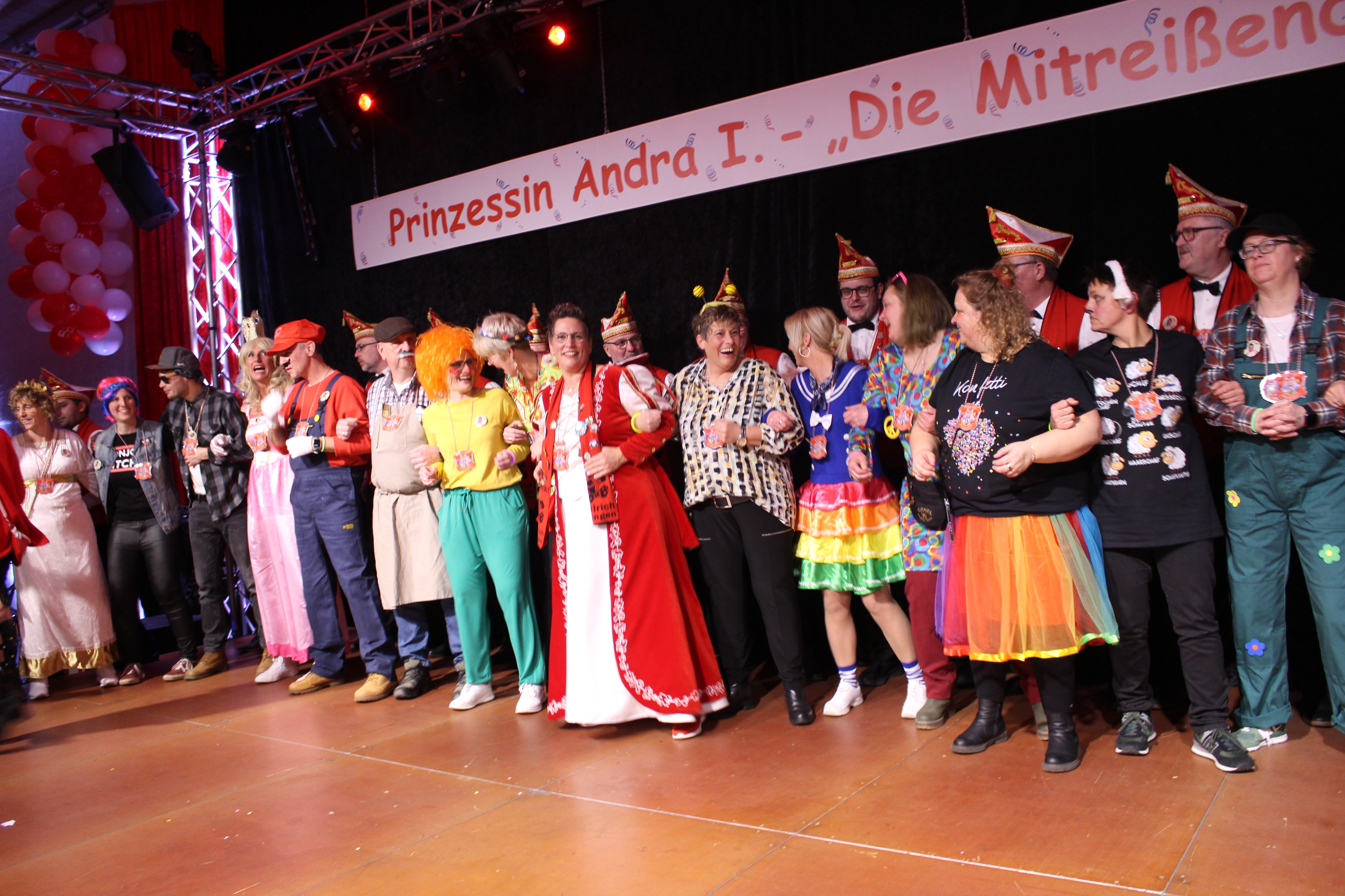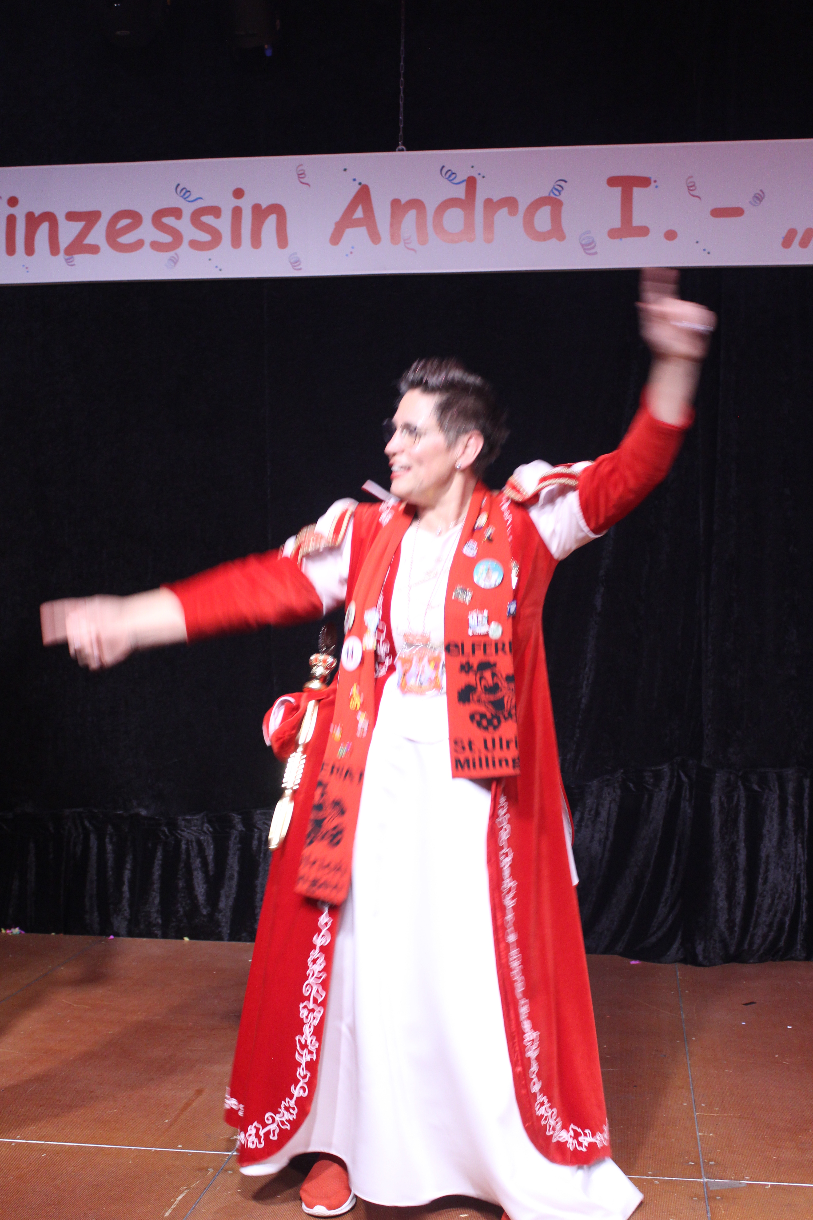 Und ob wir das schaffen!!!. Paul van Holt als niederrheinische Schnapsdrossel ließ die Lachmuskeln der Narrenschar nicht zur Ruhe kommen und jagte einen Gag nach dem anderem über die Bühne. Und als Dagmar und Thomas Gilles, als Maite Kelly und Roland Kaiser, im Duett performten, tanzte der ganze Saal. Nach den Ehrungen und Ordensübergaben an die Freunde und Familie der Prinzessin, begrüßte diese eine große Abordnung des Zugvereins Oppum mit der Prinzengarde. Danach musste erst einmal feucht durchgewischt werden, denn als Putzkräfte mit Migrationvordergrund ließen Petra Heinen als pfälzerische Klofrau und Vize Präsident Normen Grobitzsch als sächsischer Hausmeister kein Auge trocken. Als Tanzeinlage konnten die Oschauer Funken, bei der die Tochter der Prinzessin, Sarah Spandick, tanzt begeistern.
