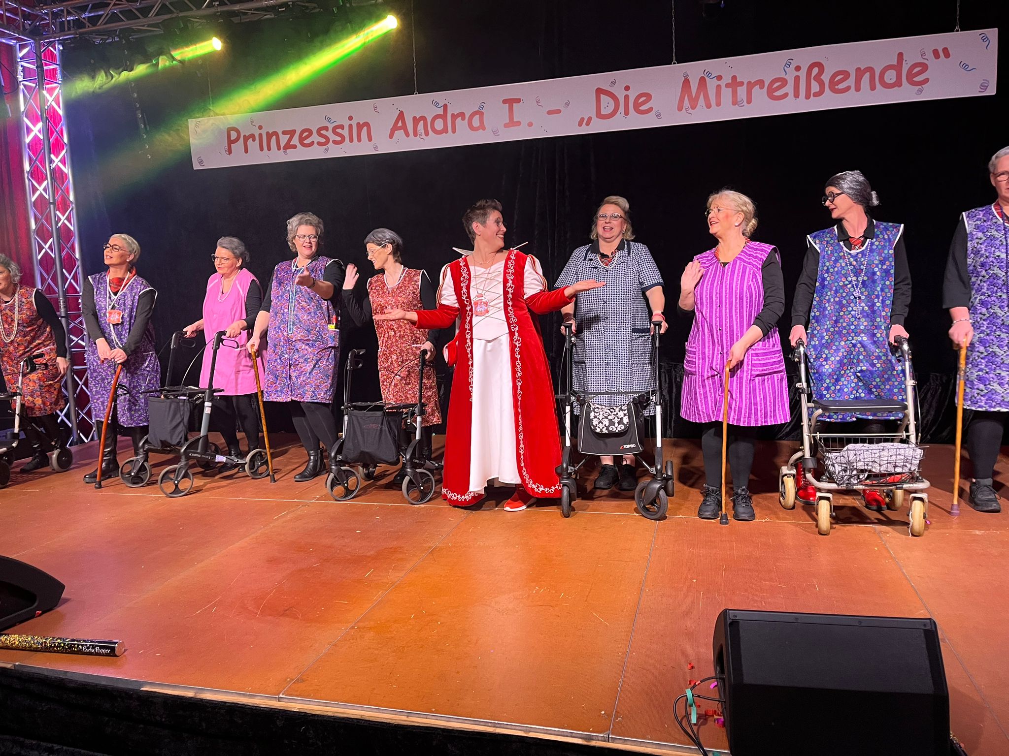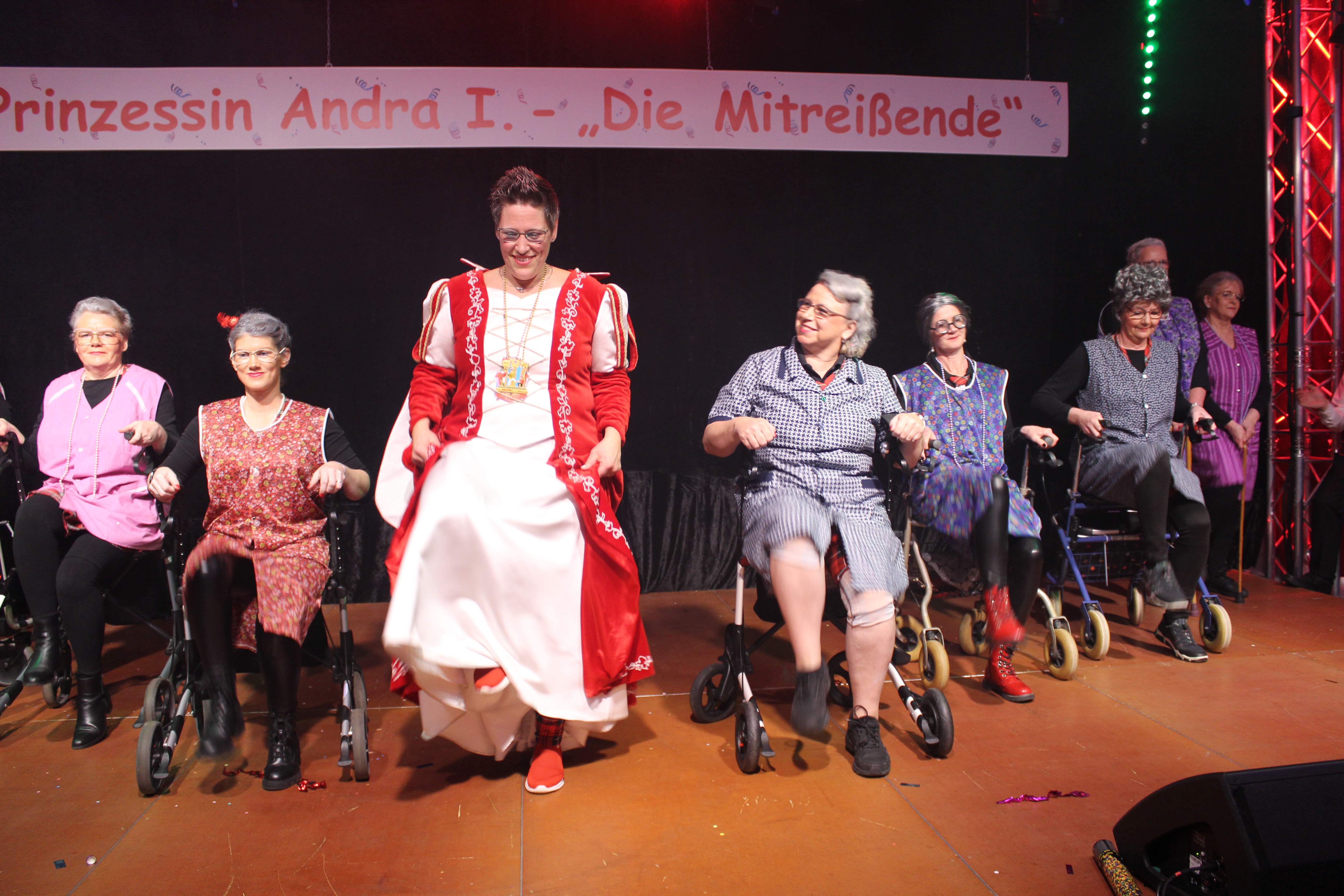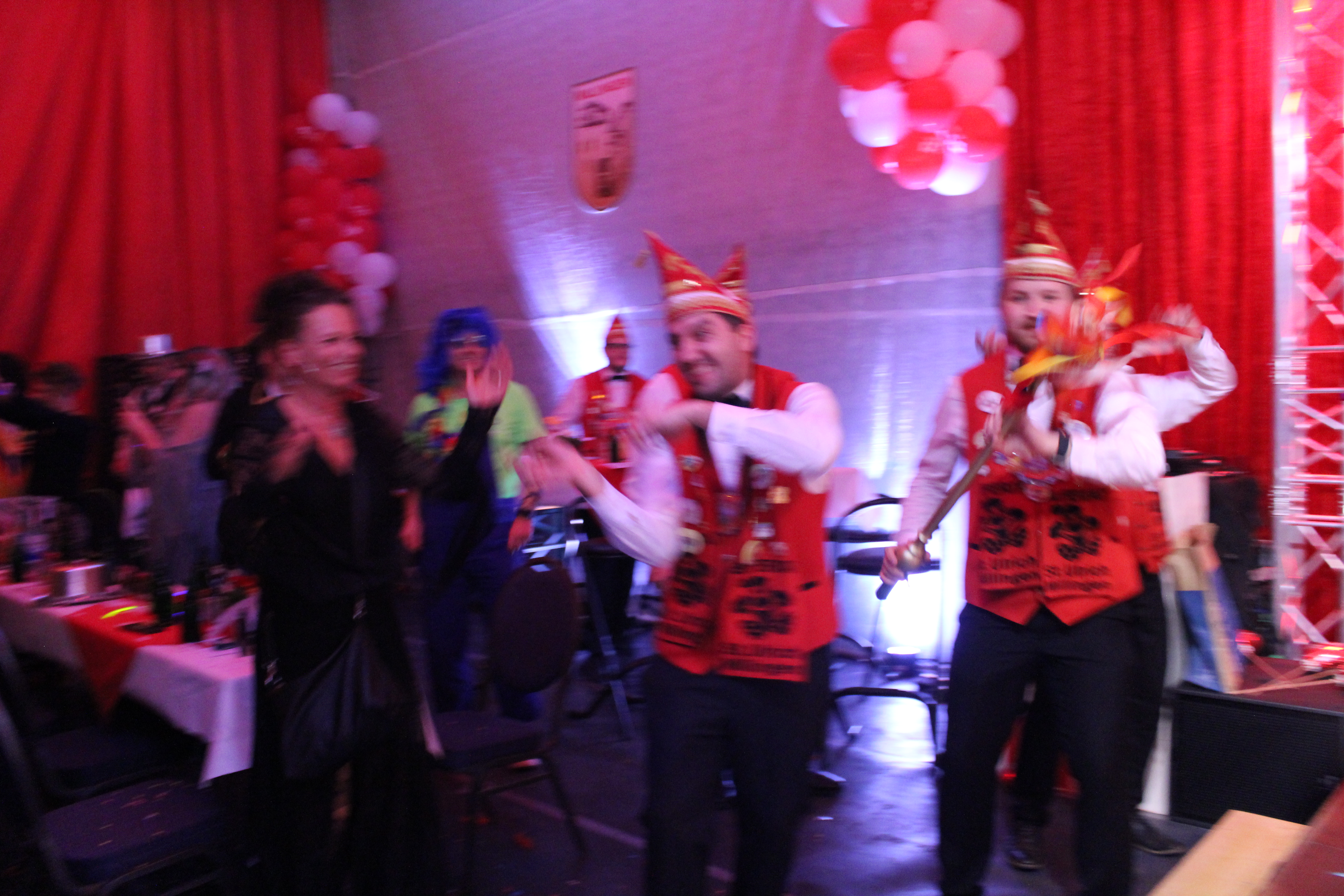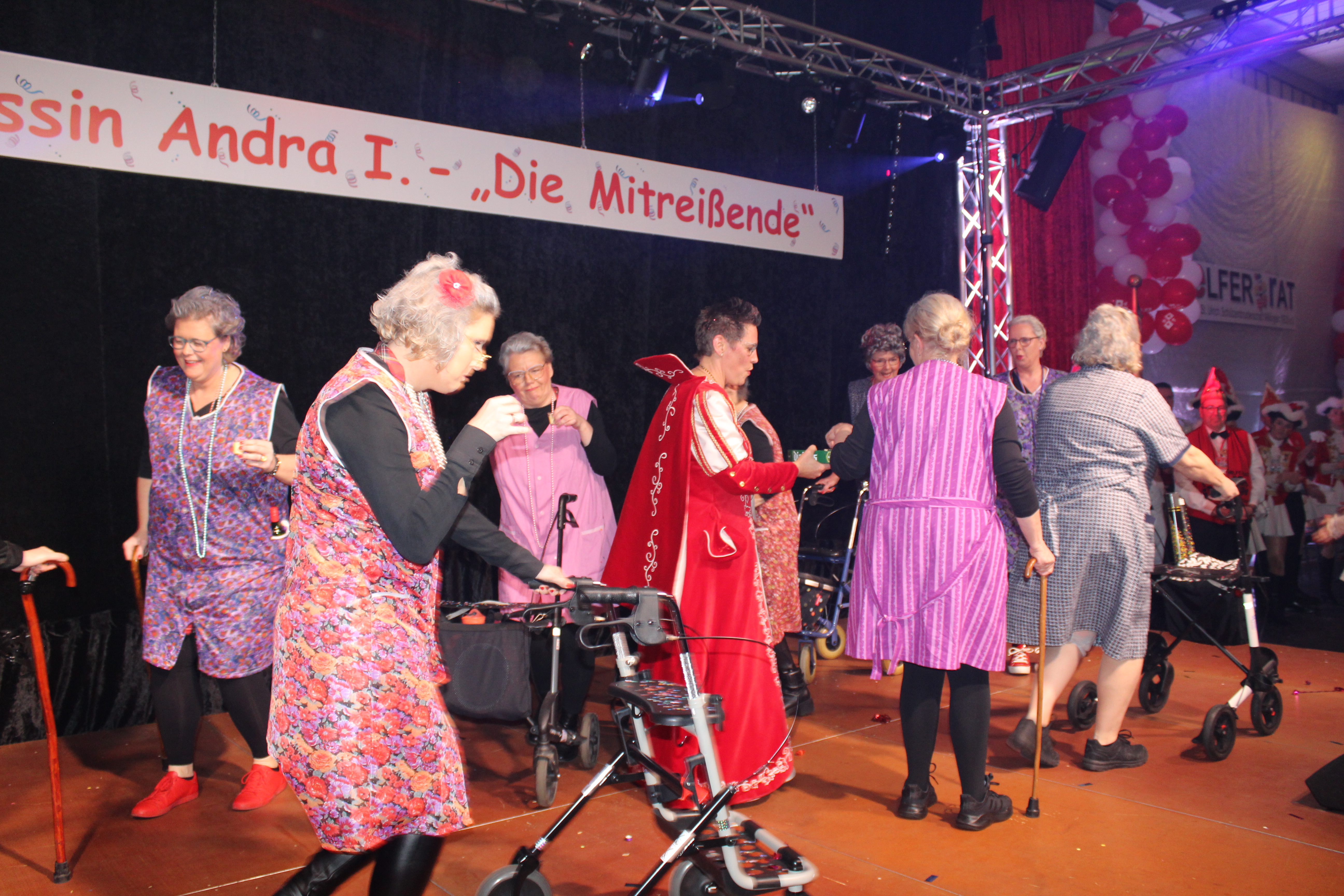 Und ob wir das schaffen!!!. Paul van Holt als niederrheinische Schnapsdrossel ließ die Lachmuskeln der Narrenschar nicht zur Ruhe kommen und jagte einen Gag nach dem anderem über die Bühne. Und als Dagmar und Thomas Gilles, als Maite Kelly und Roland Kaiser, im Duett performten, tanzte der ganze Saal. Nach den Ehrungen und Ordensübergaben an die Freunde und Familie der Prinzessin, begrüßte diese eine große Abordnung des Zugvereins Oppum mit der Prinzengarde. Danach musste erst einmal feucht durchgewischt werden, denn als Putzkräfte mit Migrationvordergrund ließen Petra Heinen als pfälzerische Klofrau und Vize Präsident Normen Grobitzsch als sächsischer Hausmeister kein Auge trocken. Als Tanzeinlage konnten die Oschauer Funken, bei der die Tochter der Prinzessin, Sarah Spandick, tanzt begeistern.