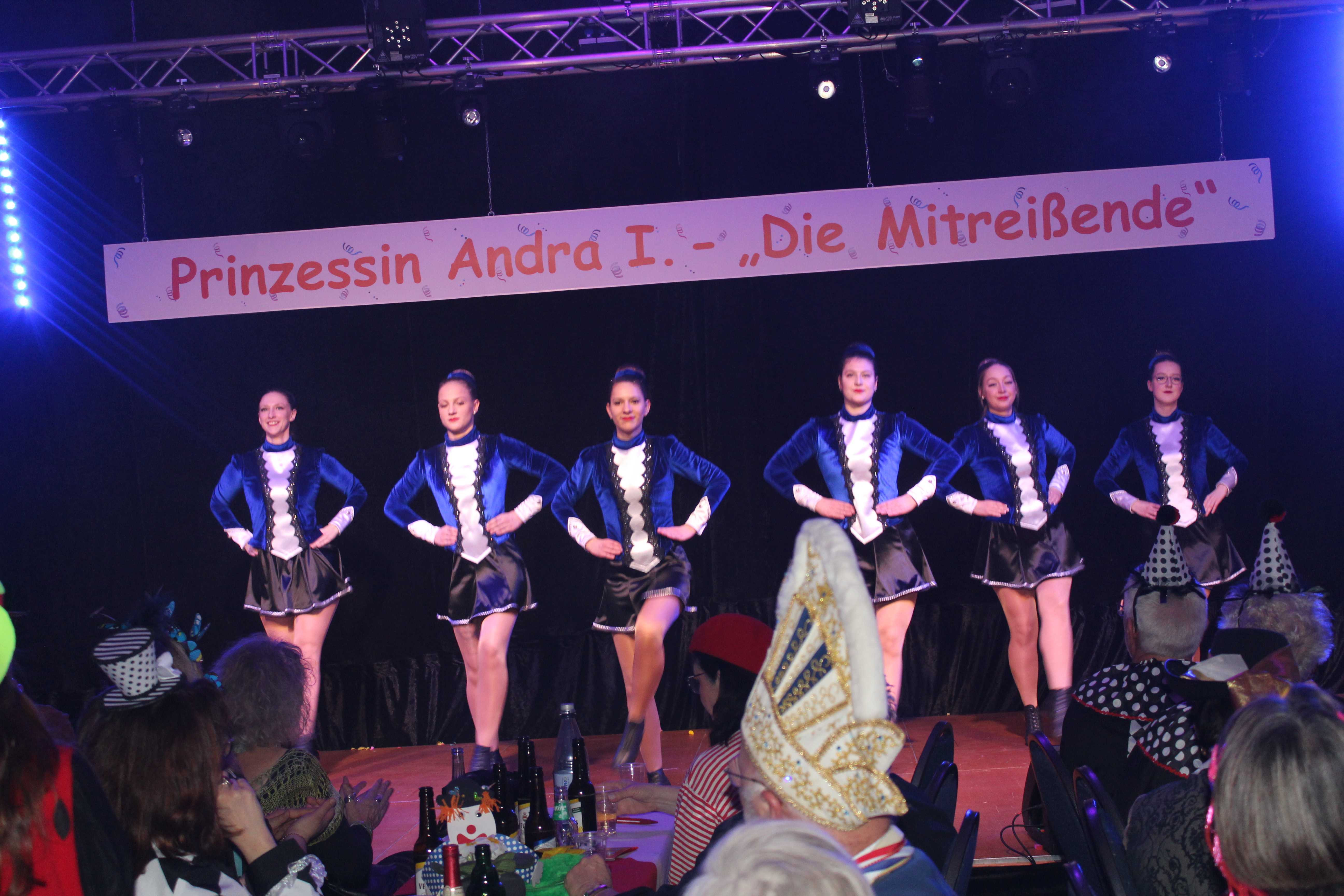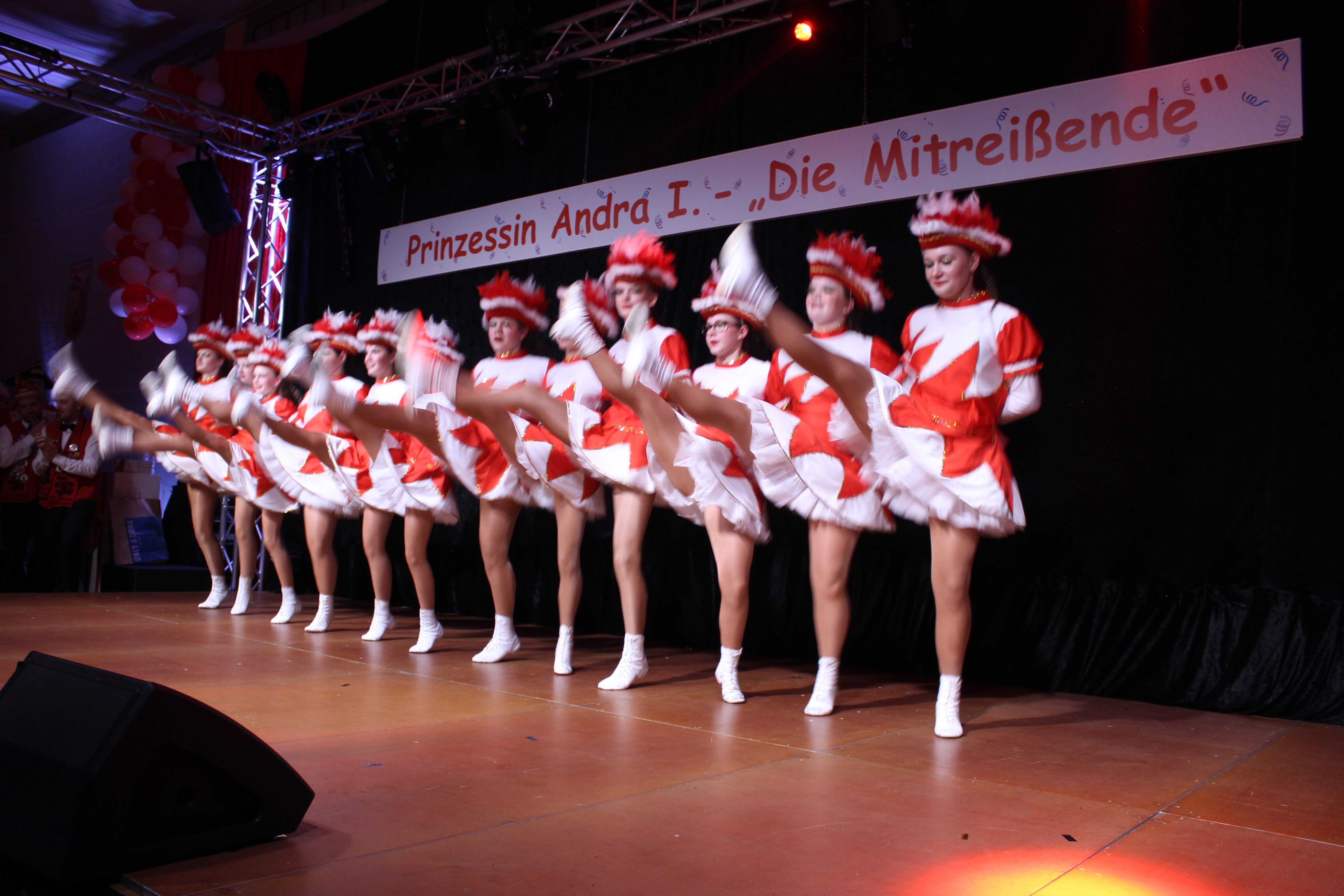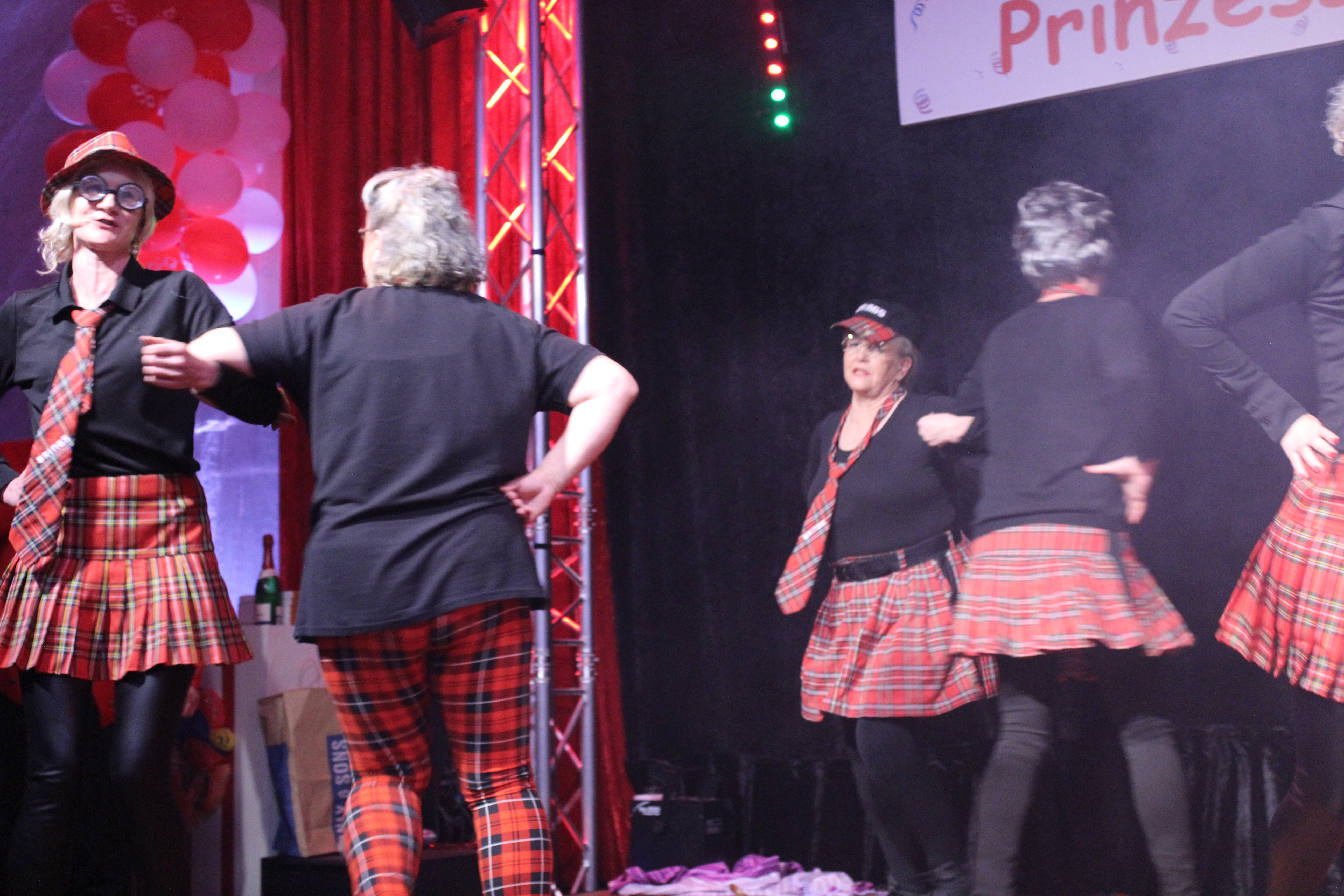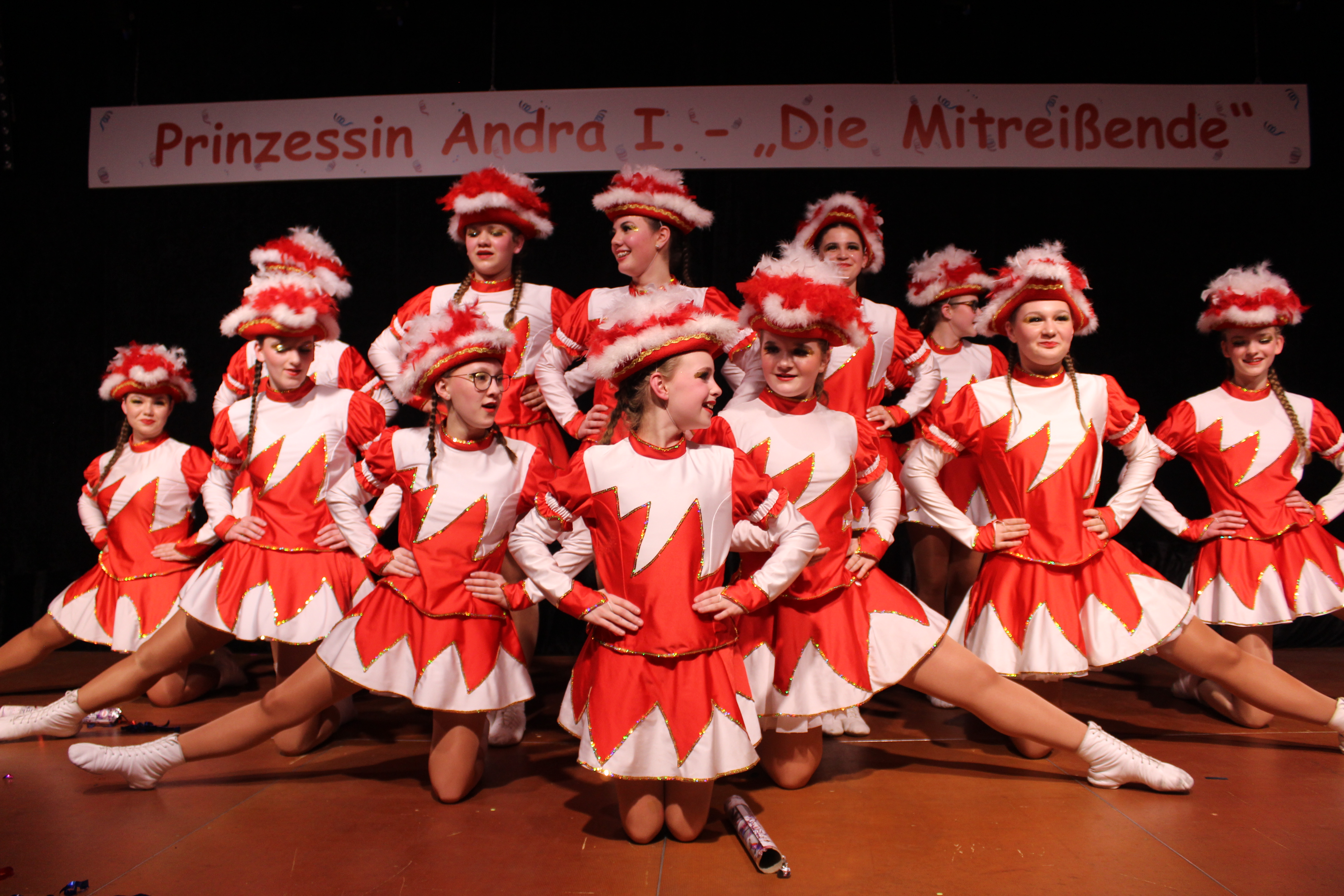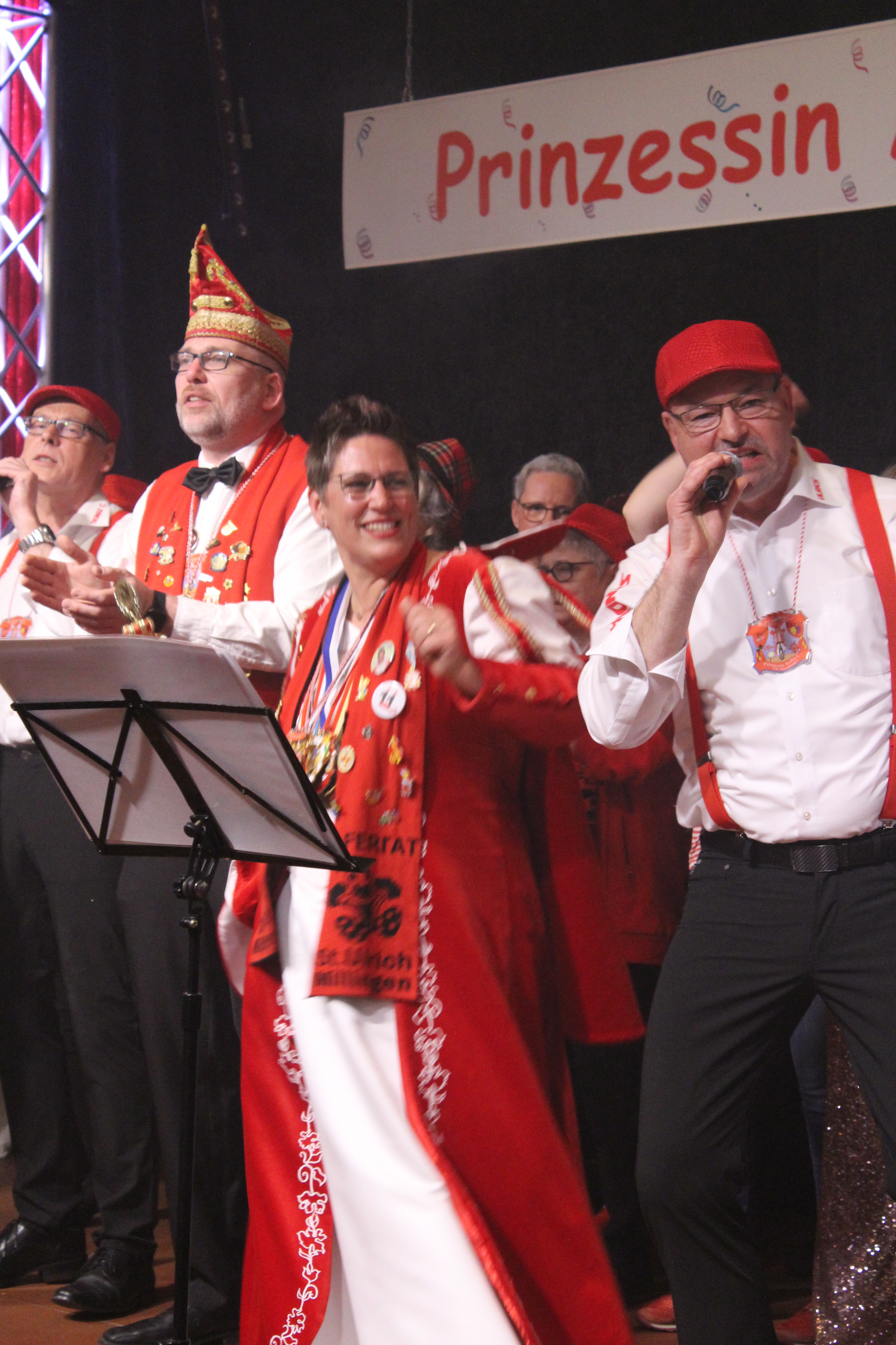 Und ob wir das schaffen!!!. Paul van Holt als niederrheinische Schnapsdrossel ließ die Lachmuskeln der Narrenschar nicht zur Ruhe kommen und jagte einen Gag nach dem anderem über die Bühne. Und als Dagmar und Thomas Gilles, als Maite Kelly und Roland Kaiser, im Duett performten, tanzte der ganze Saal. Nach den Ehrungen und Ordensübergaben an die Freunde und Familie der Prinzessin, begrüßte diese eine große Abordnung des Zugvereins Oppum mit der Prinzengarde. Danach musste erst einmal feucht durchgewischt werden, denn als Putzkräfte mit Migrationvordergrund ließen Petra Heinen als pfälzerische Klofrau und Vize Präsident Normen Grobitzsch als sächsischer Hausmeister kein Auge trocken. Als Tanzeinlage konnten die Oschauer Funken, bei der die Tochter der Prinzessin, Sarah Spandick, tanzt begeistern.