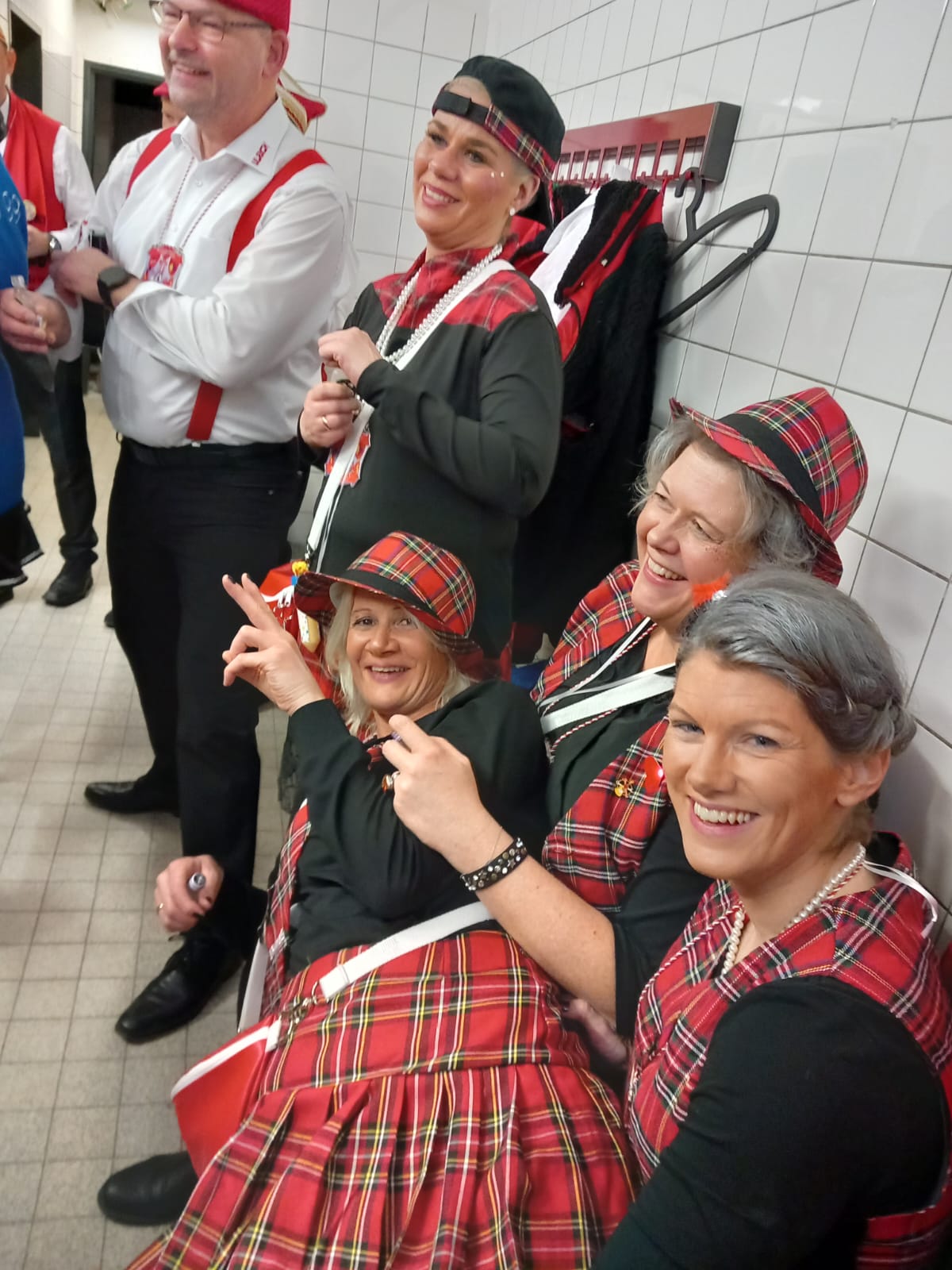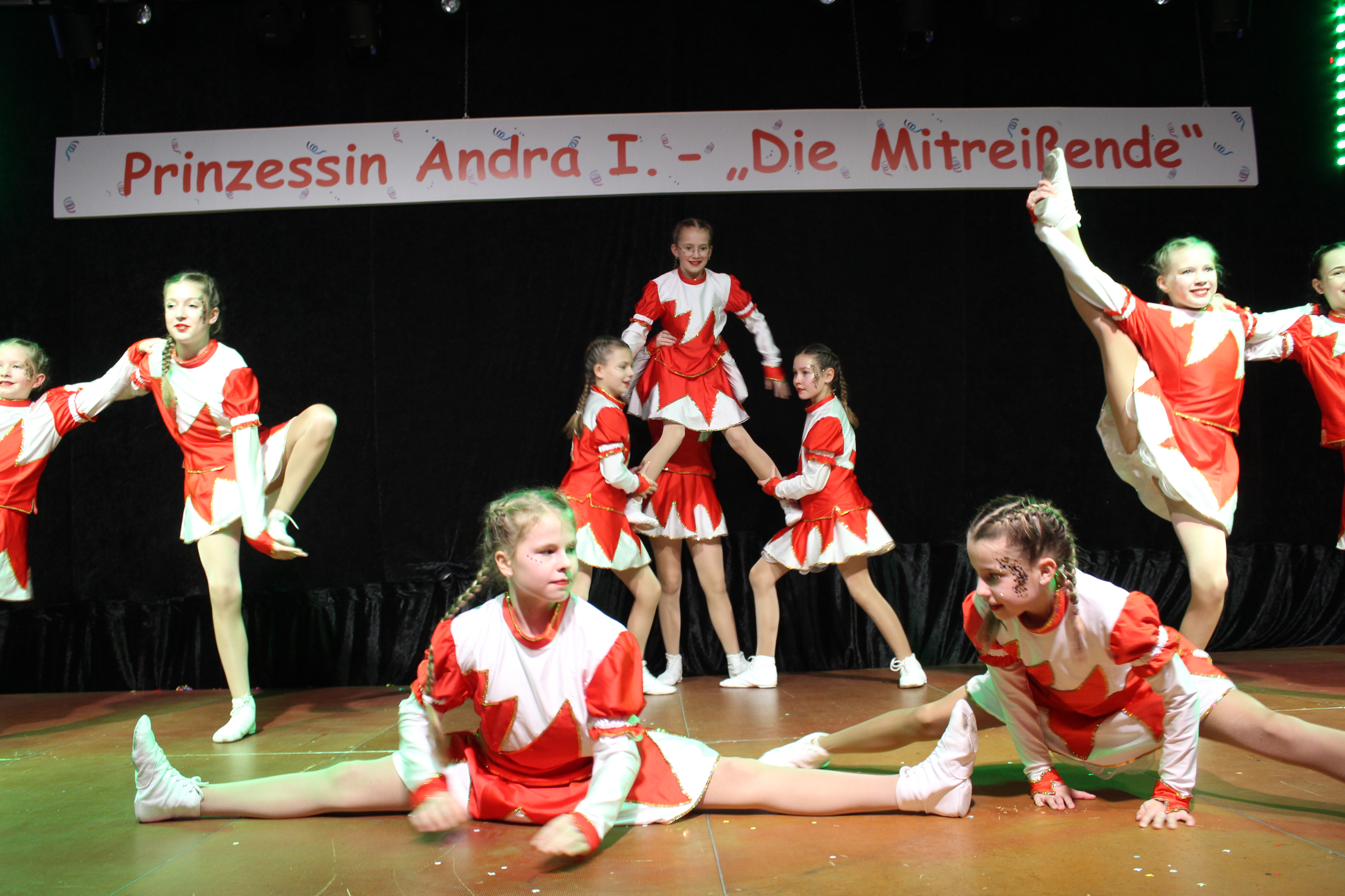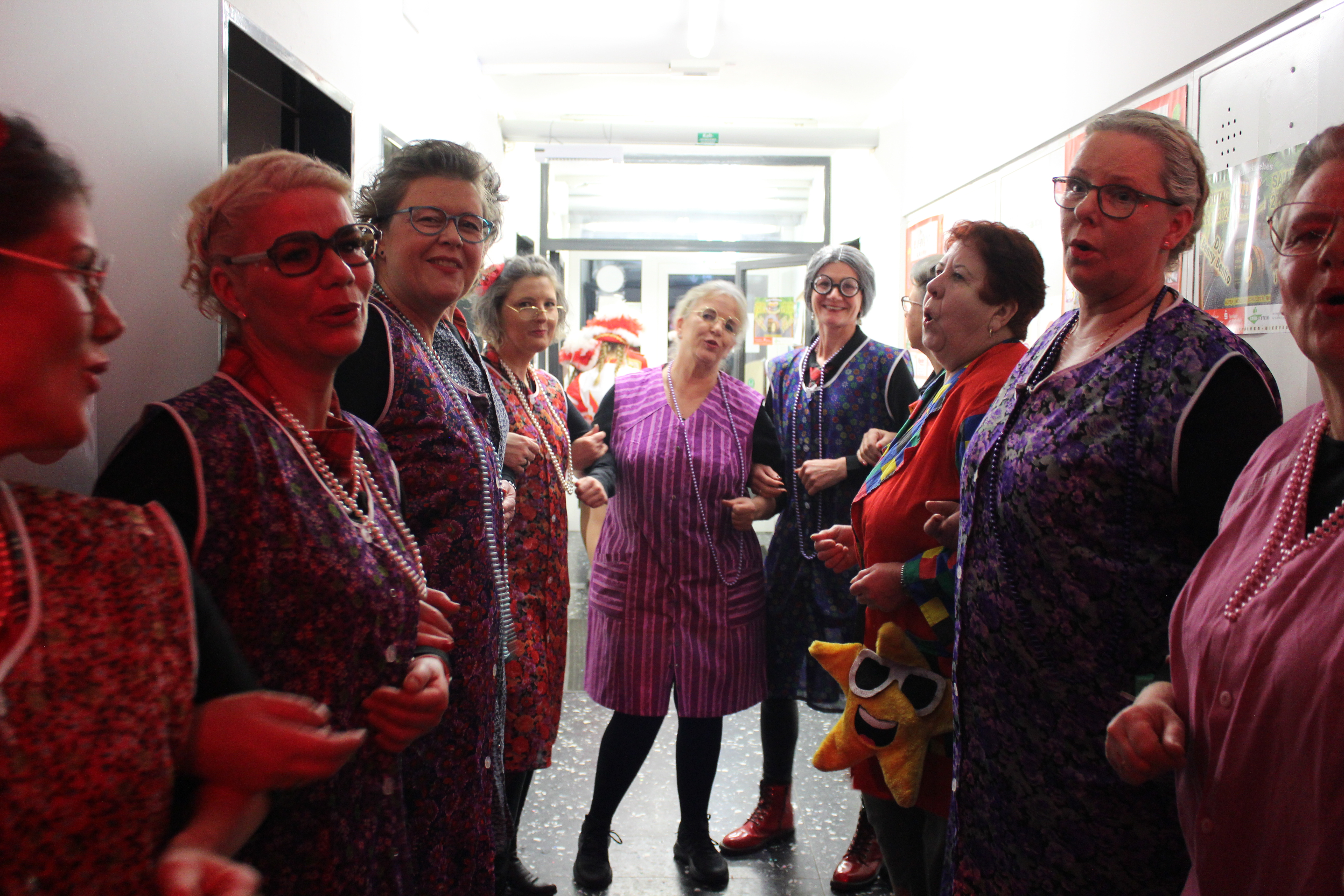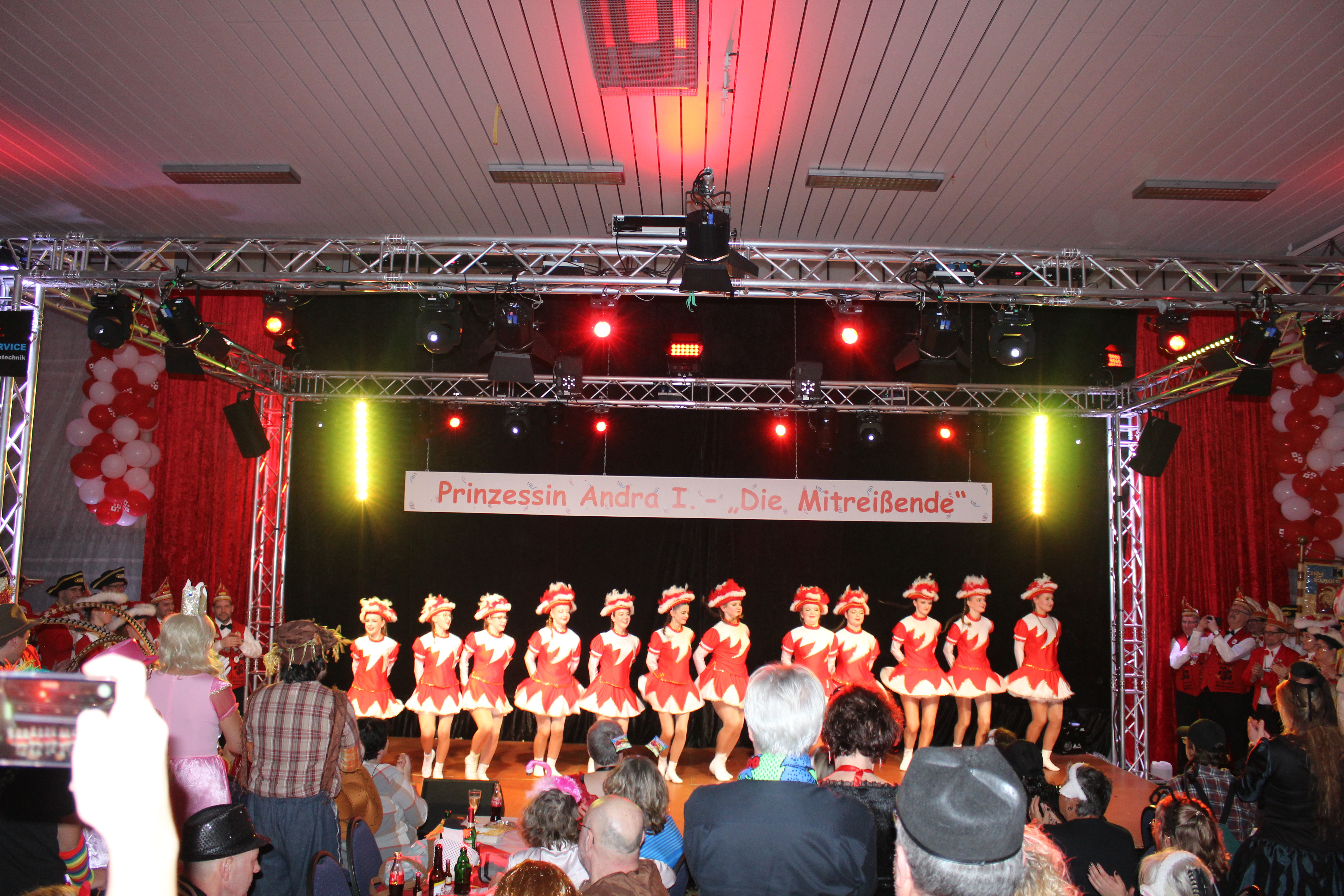 Und ob wir das schaffen!!!. Paul van Holt als niederrheinische Schnapsdrossel ließ die Lachmuskeln der Narrenschar nicht zur Ruhe kommen und jagte einen Gag nach dem anderem über die Bühne. Und als Dagmar und Thomas Gilles, als Maite Kelly und Roland Kaiser, im Duett performten, tanzte der ganze Saal. Nach den Ehrungen und Ordensübergaben an die Freunde und Familie der Prinzessin, begrüßte diese eine große Abordnung des Zugvereins Oppum mit der Prinzengarde. Danach musste erst einmal feucht durchgewischt werden, denn als Putzkräfte mit Migrationvordergrund ließen Petra Heinen als pfälzerische Klofrau und Vize Präsident Normen Grobitzsch als sächsischer Hausmeister kein Auge trocken. Als Tanzeinlage konnten die Oschauer Funken, bei der die Tochter der Prinzessin, Sarah Spandick, tanzt begeistern.